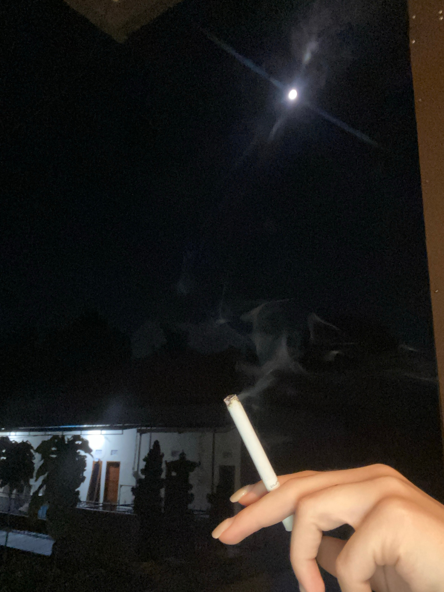 A hand holds a lit cigarette with smoke rising. A dim light source, likely the moon, is visible in the distance on the left. A building with lighted windows is visible in the background. The location,…read more