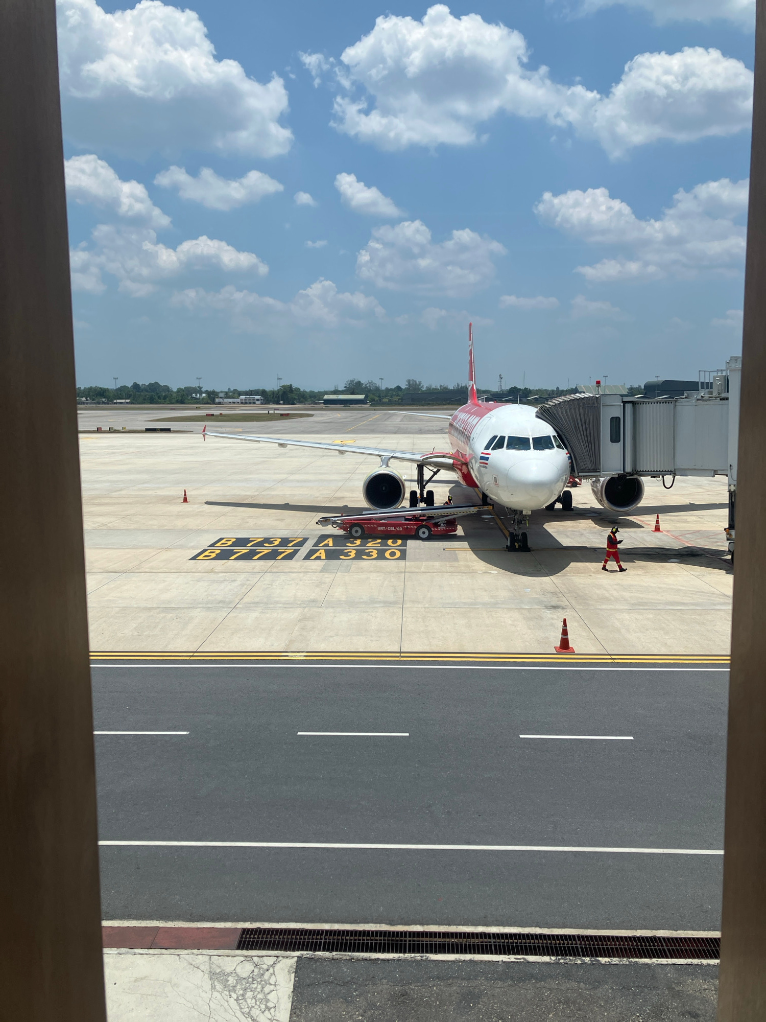 The scene depicts an airplane parked at an airport gate, observed from an elevated position indoors, possibly a waiting area. The airplane is a red and white Airbus A320, with "B737 A320" and "B777 A3…read more