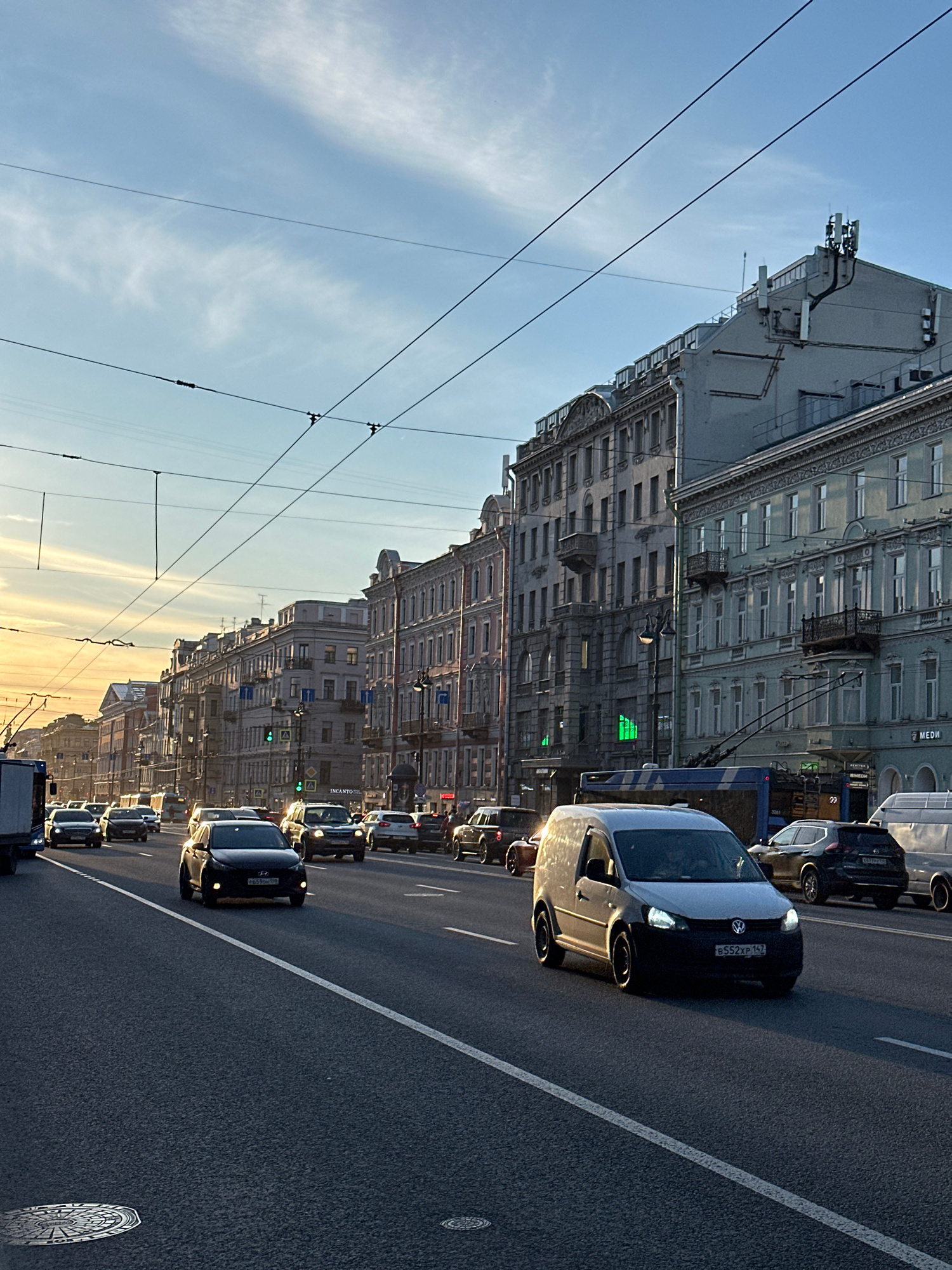 A street scene in Saint Petersburg, Russia, shows a line of vehicles on a multi-lane street bordered by tall buildings. The sky is partly cloudy with sunlight. Power lines are visible above the street…read more