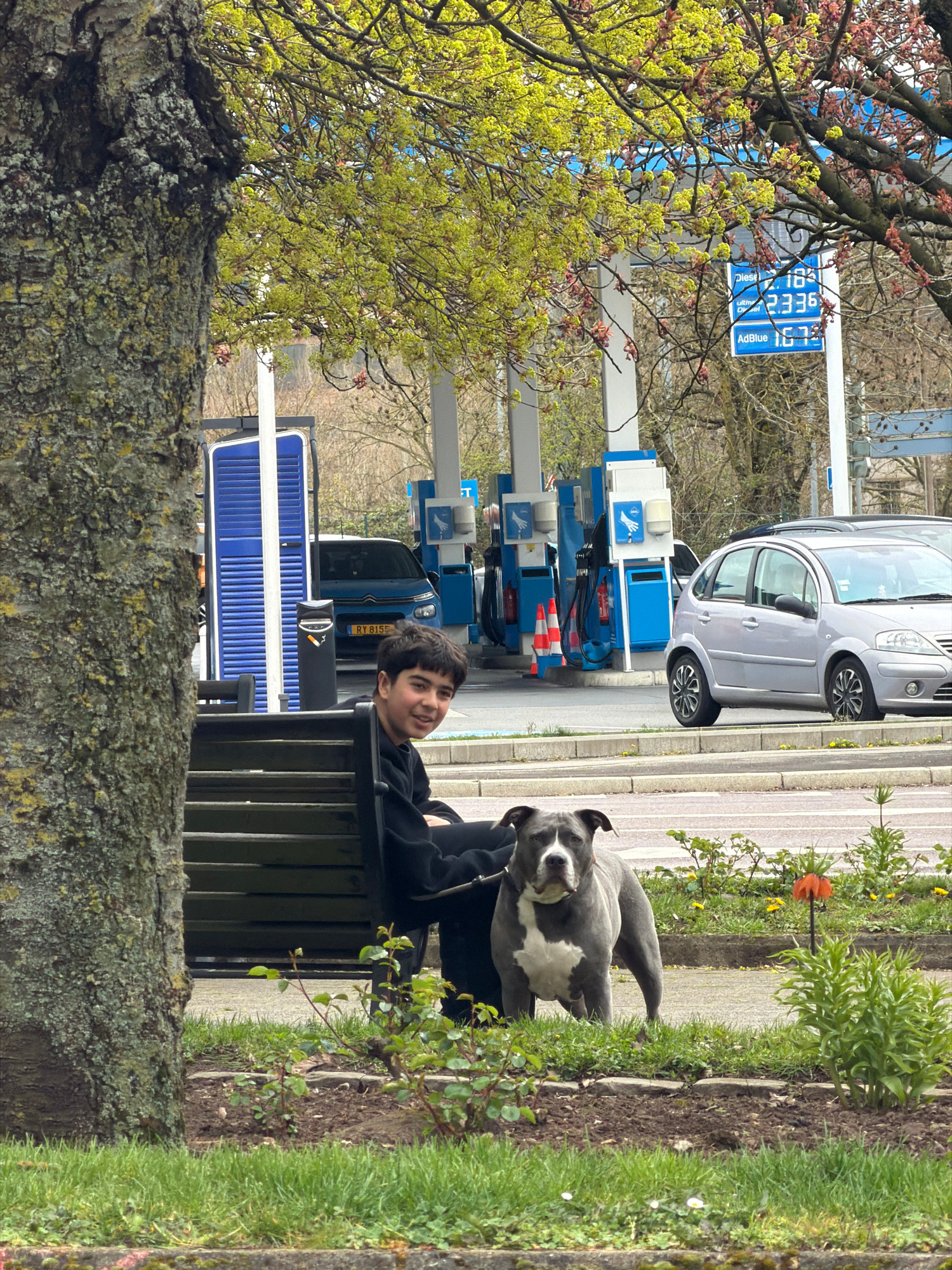 The image shows a gas station in Esch-sur-Alzette, Luxembourg. A young man is sitting on a black metal park bench with a gray and white dog resting on the bench near him. The gas station has several b…read more