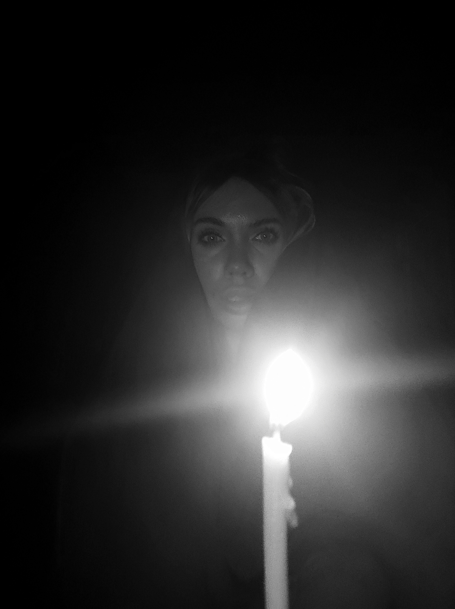 A black and white image features a person holding a lit candle in the dark. The light from the candle illuminates the person's face, revealing their eyes and mouth. The environment is otherwise indist…read more