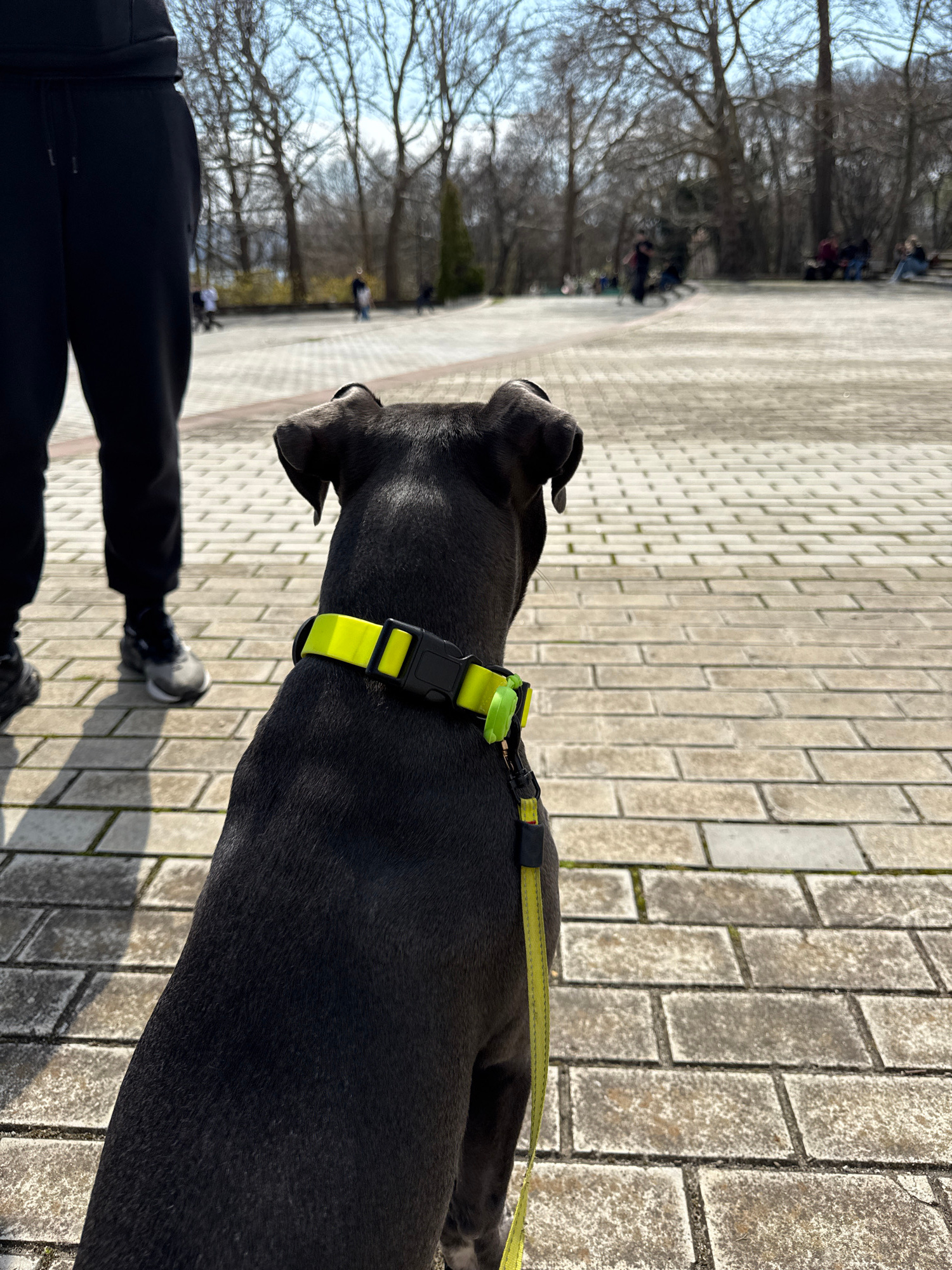 A black dog with a neon yellow collar and leash is walking on a brick walkway. A person wearing black pants and sneakers is walking the dog. Trees and other people are visible in the background. The i…read more