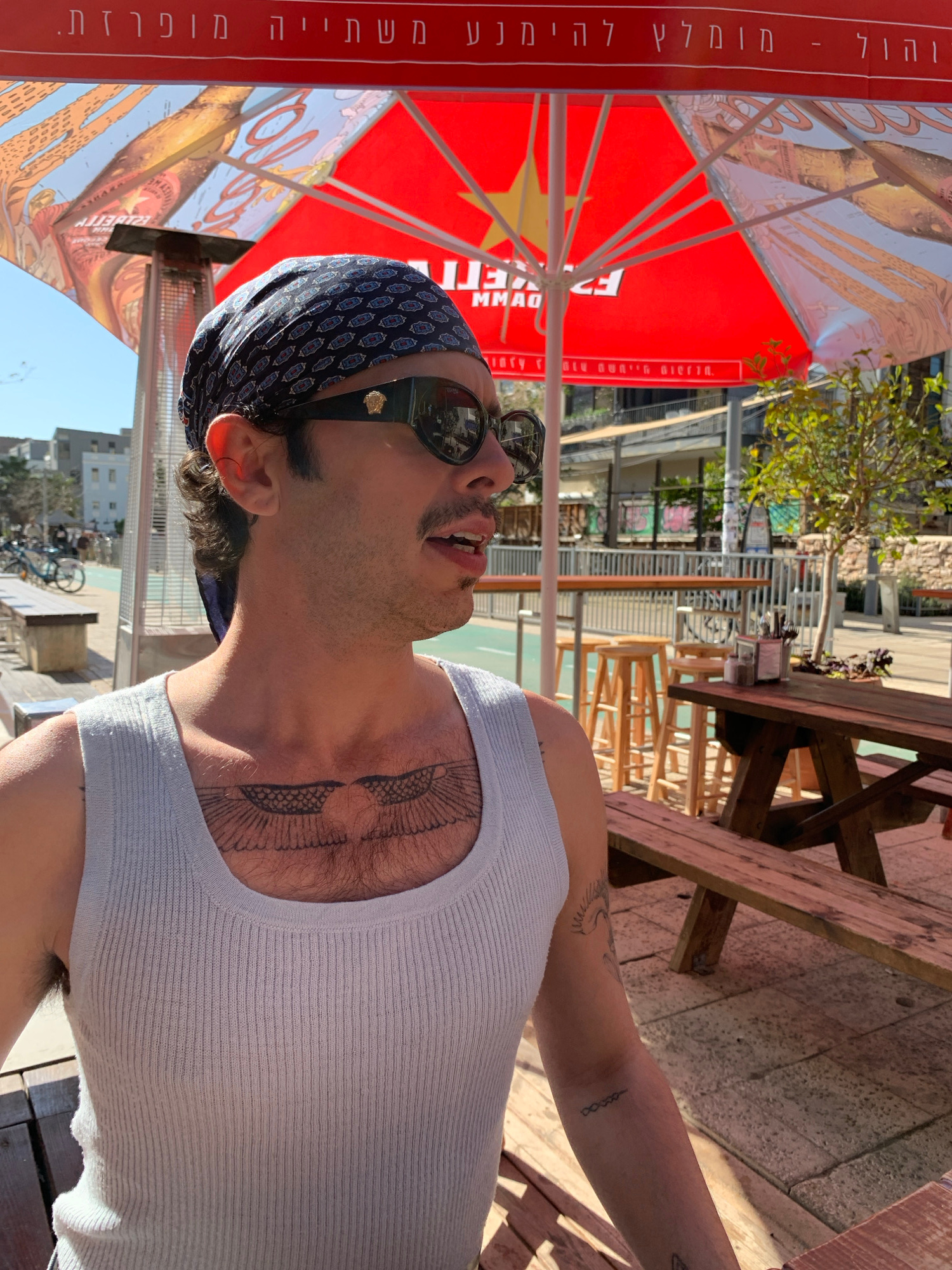 A man is sitting at a table under an umbrella, seemingly outdoors. He is wearing a white tank top, sunglasses, and a bandana. The man has tattoos on his chest and arm. A wooden picnic table sits nearb…read more