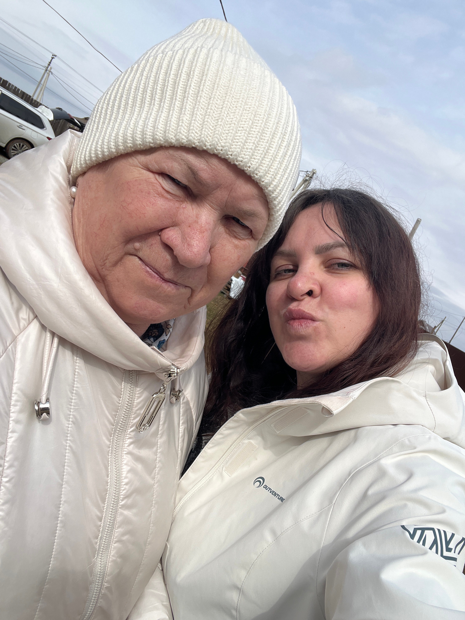 This close-up selfie captures two women outdoors under an overcast sky, taken in Protasy, Russia. The image is tilted, giving a dynamic angle. On the left, an older woman is visible from the shoulder…read more