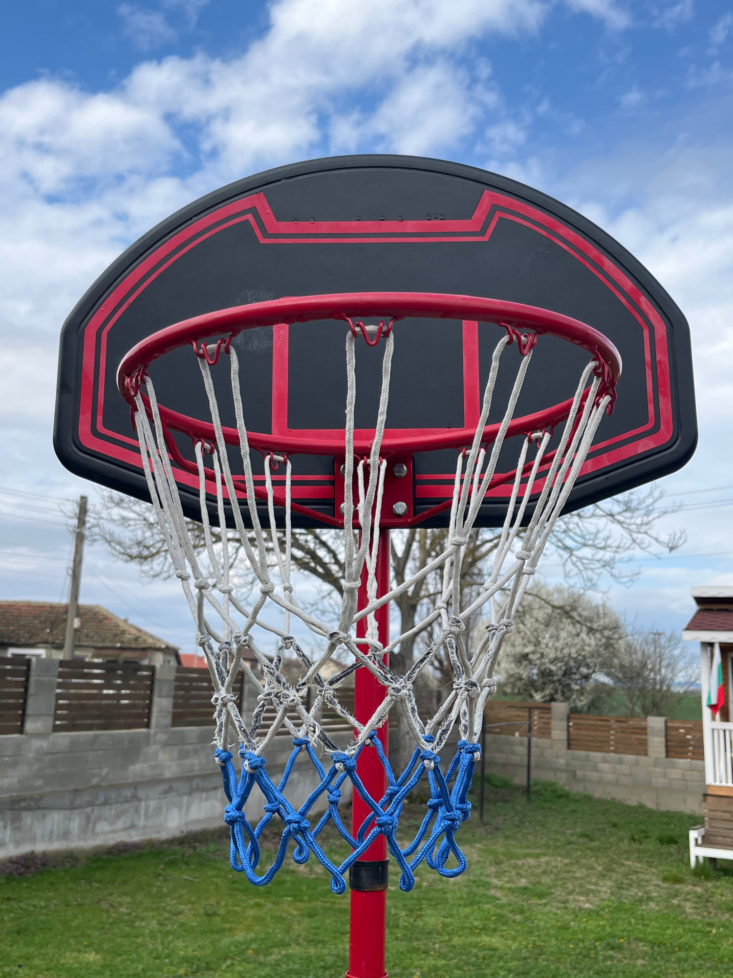 A close-up, low-angle shot shows a basketball hoop in Pchelnik, Bulgaria. The hoop has a black backboard with red trim. The net is primarily white with sections of blue knots. The hoop is attached toβ¦read more