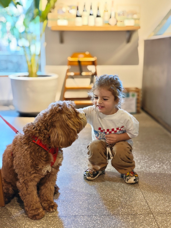 This image, captured in Mumbai, India, depicts a young child interacting with a dog indoors. A light-skinned child, estimated to be a toddler or preschooler, with curly light brown hair, is crouched dβ¦read more