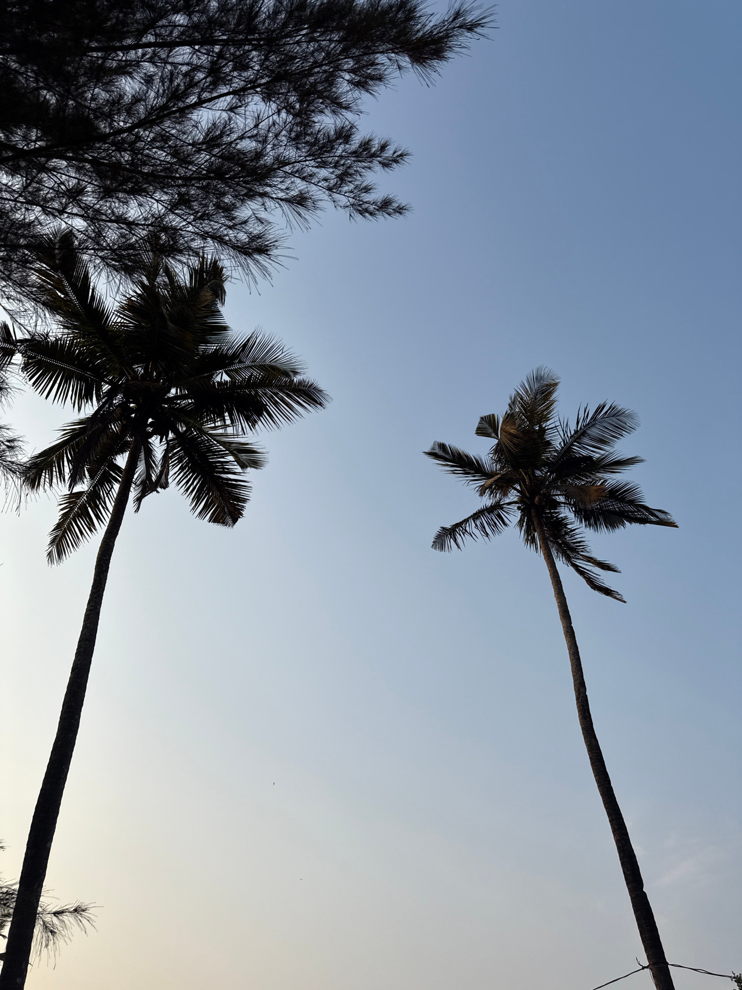 The image depicts a low-angle view of palm trees and other vegetation against a gradient blue sky in Arambol, India. The scene is likely captured during either sunrise or sunset based on the light qua…read more