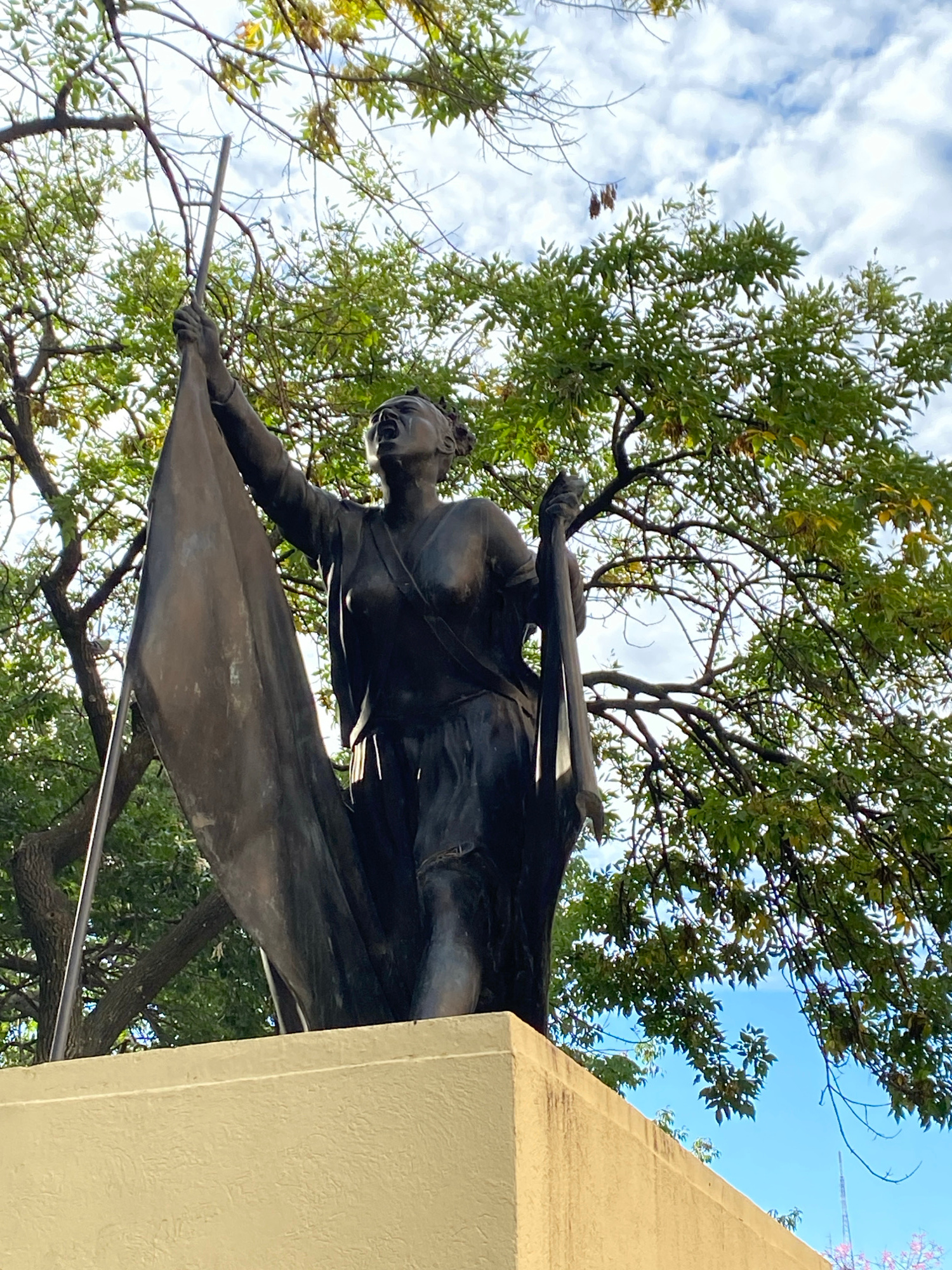 The image presents a low-angle view of a bronze statue mounted on a stone structure, situated in an outdoor environment with trees overhead. The statue depicts a figure in what appears to be battle cl…read more