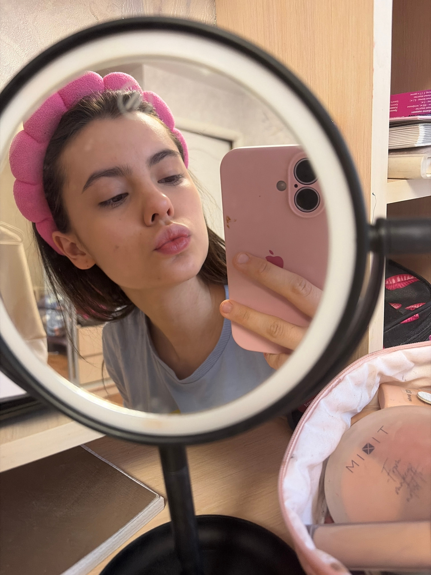 The image shows a selfie taken in a mirror with a ring light. A young woman with dark hair and eyebrows is visible in the mirror's reflection. She is wearing a pink headband and a light blue shirt. Sh…read more