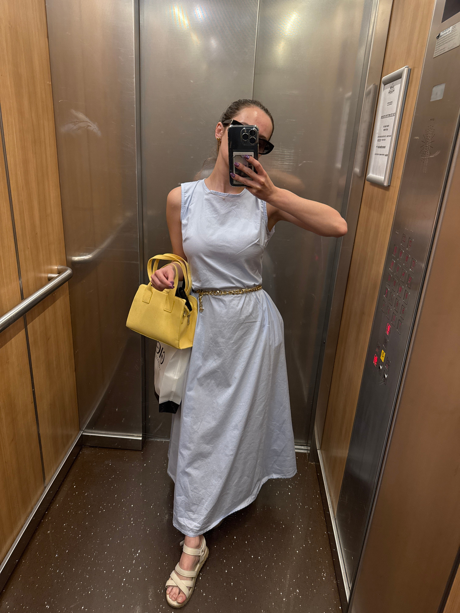 A woman is captured taking a mirror selfie inside an elevator. She is seen from the chest down, holding a black smartphone (likely an iPhone due to its triple-lens camera) in her right hand to reflect…read more