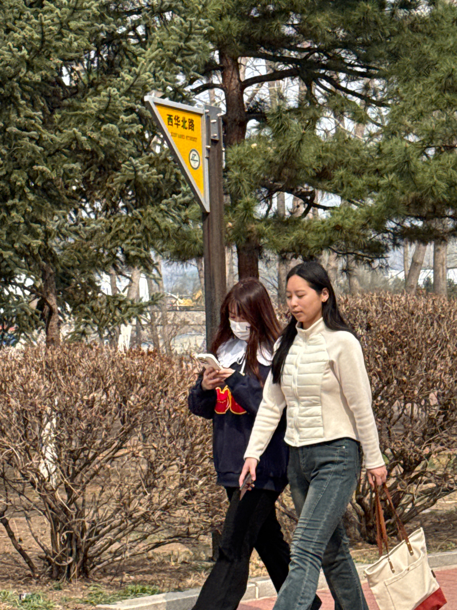 Two women are walking on a sidewalk next to trees and bushes. The woman closest to the viewer is wearing a white vest, jeans, and holding a bag with sticks inside. The other woman is wearing a dark bl…read more