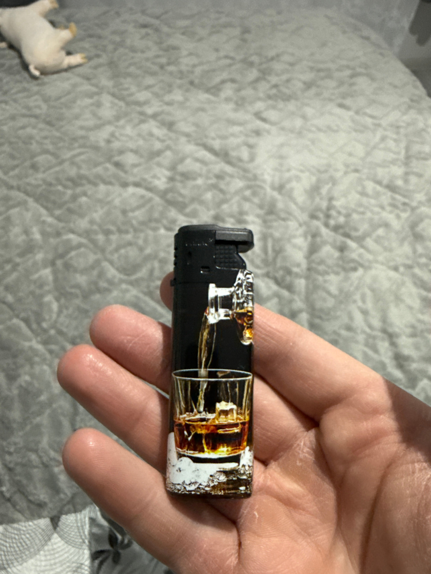 An indoor close-up shot captured in Stara Zagora, Bulgaria, shows an adult's hand holding a black cigarette lighter. The lighter features a distinctive design that mimics a glass filled with an amber…read more