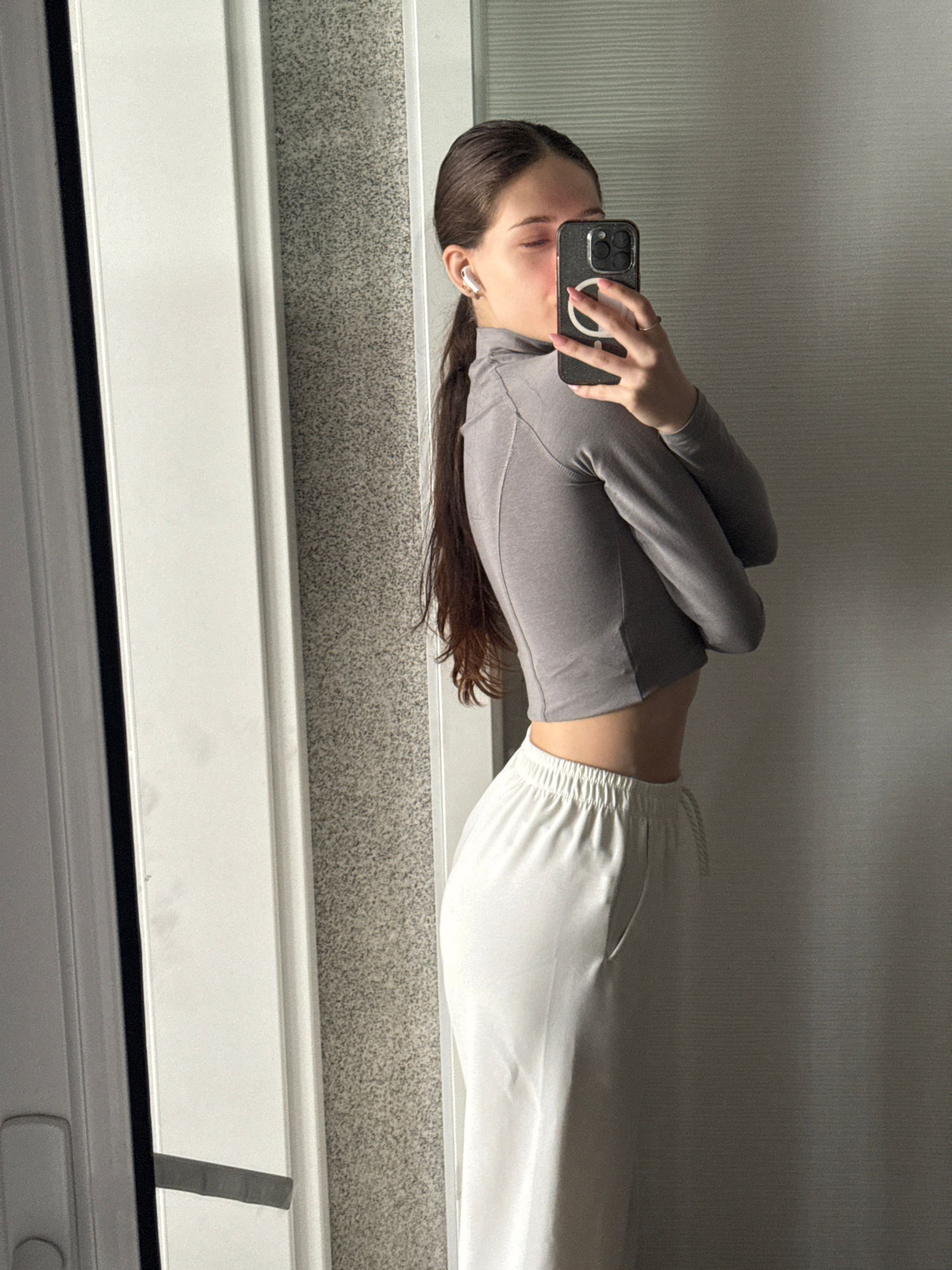 This mirror selfie, taken in Sofia, Bulgaria, features a young woman standing and capturing her reflection indoors. She has long, dark brown hair that extends past her shoulders. The woman is wearing…read more