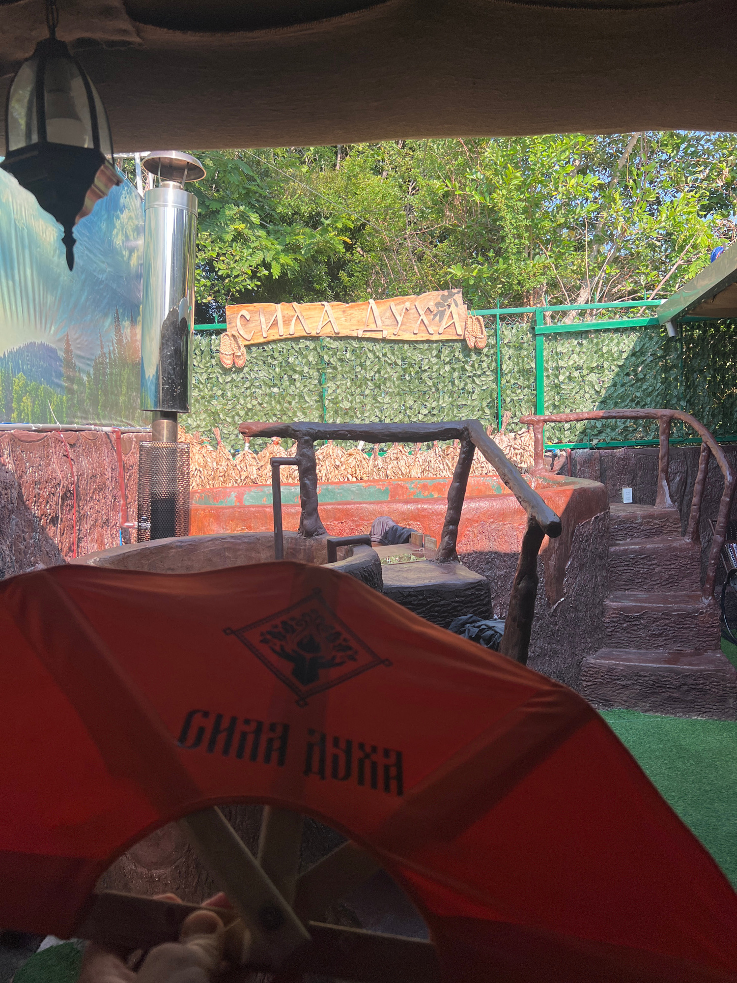 The image shows a rustic outdoor setting, possibly a patio or garden area, in what appears to be the Bac Natural Heritage Area Trang, Vietnam. The scene is somewhat obscured by an orange object, possi…read more