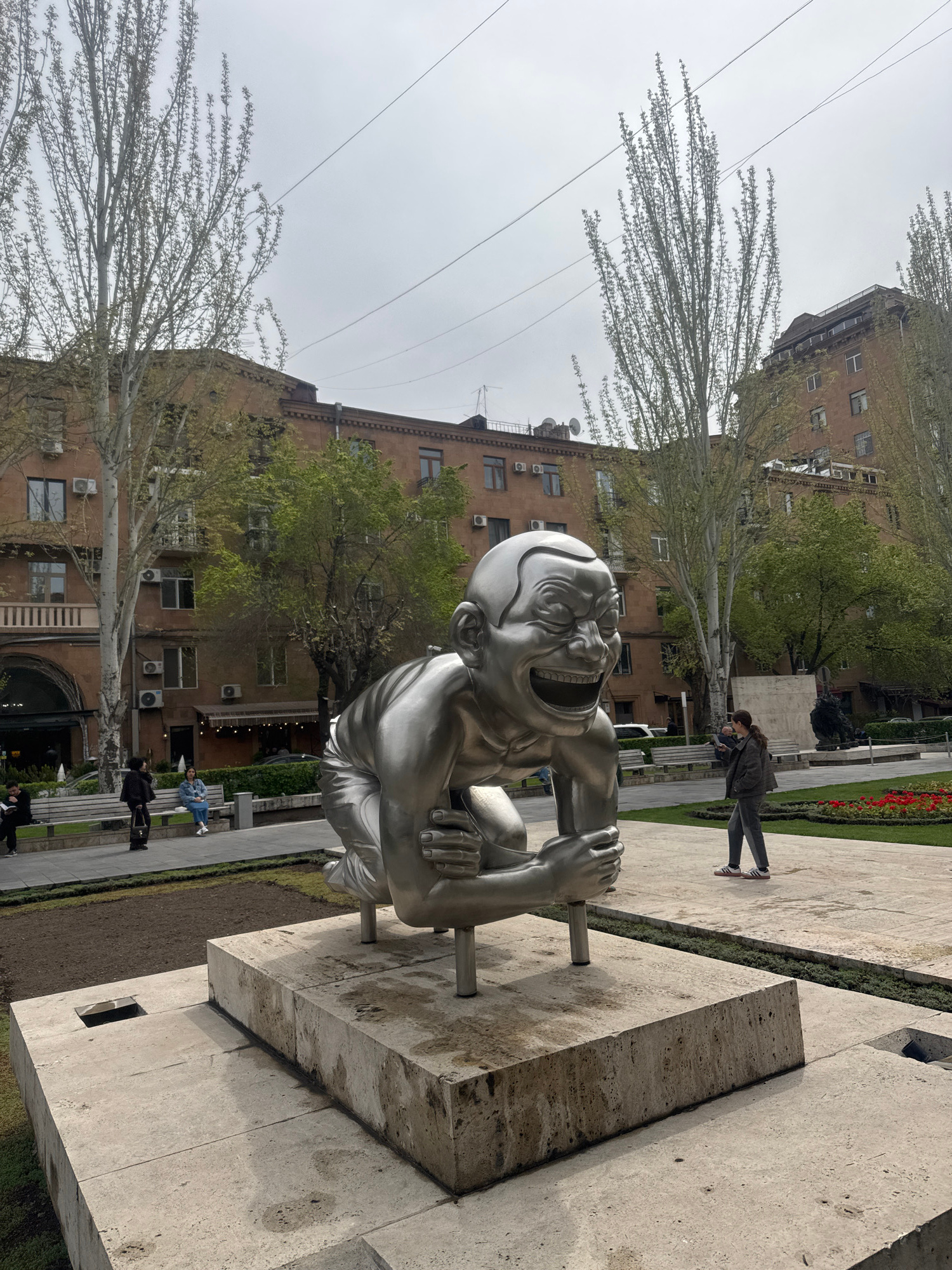 The image depicts the "Men" statues by David Yerevantsi in Yerevan, Armenia. A large, silver-colored statue of a laughing man is the prominent subject. The statue is situated on a concrete base with t…read more