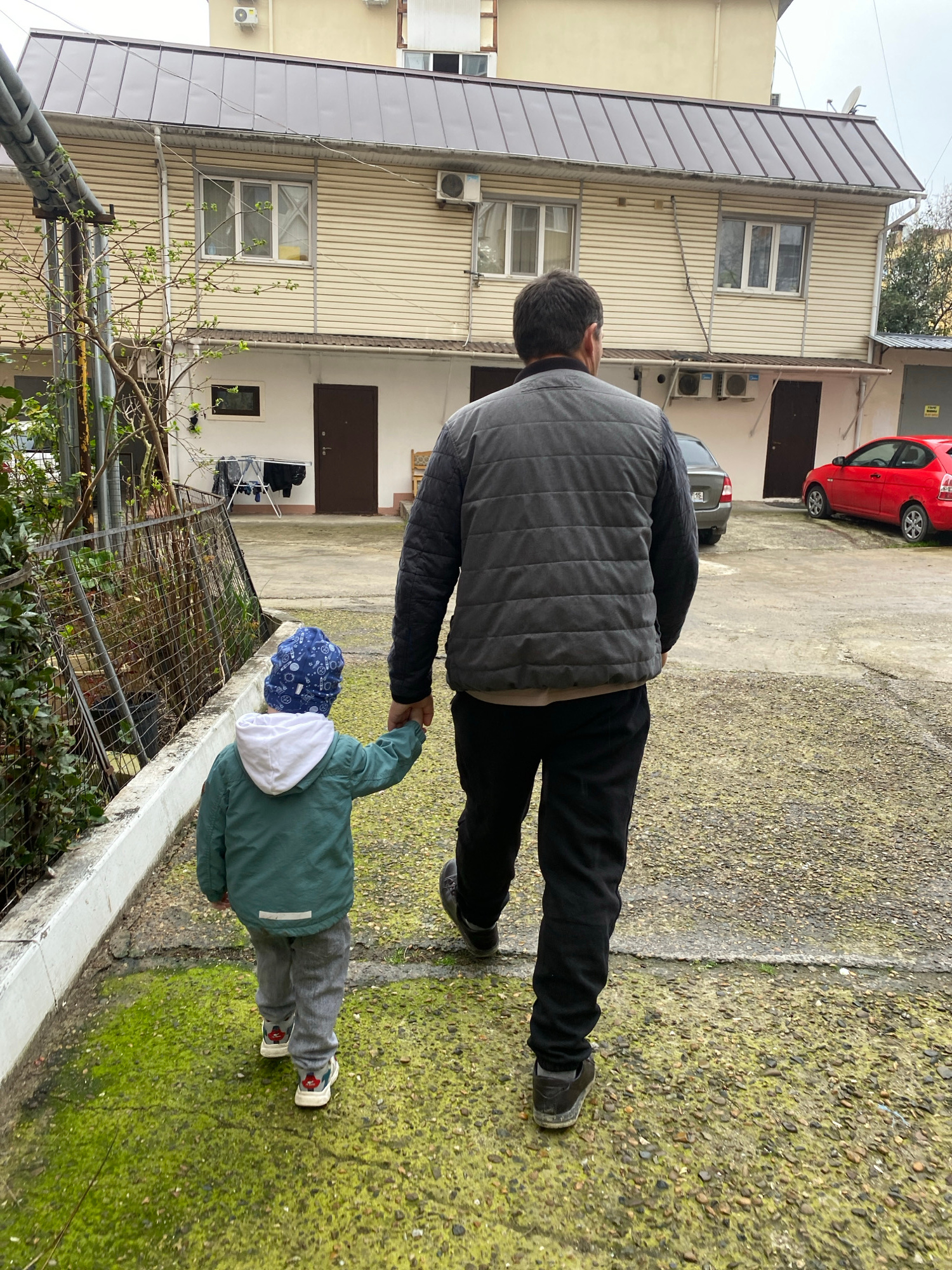 A man and a child are walking hand-in-hand on a paved surface next to a low wall and vegetation. The man is wearing black pants, dark shoes, and a gray vest. The child is wearing gray pants, a green jā¦read more