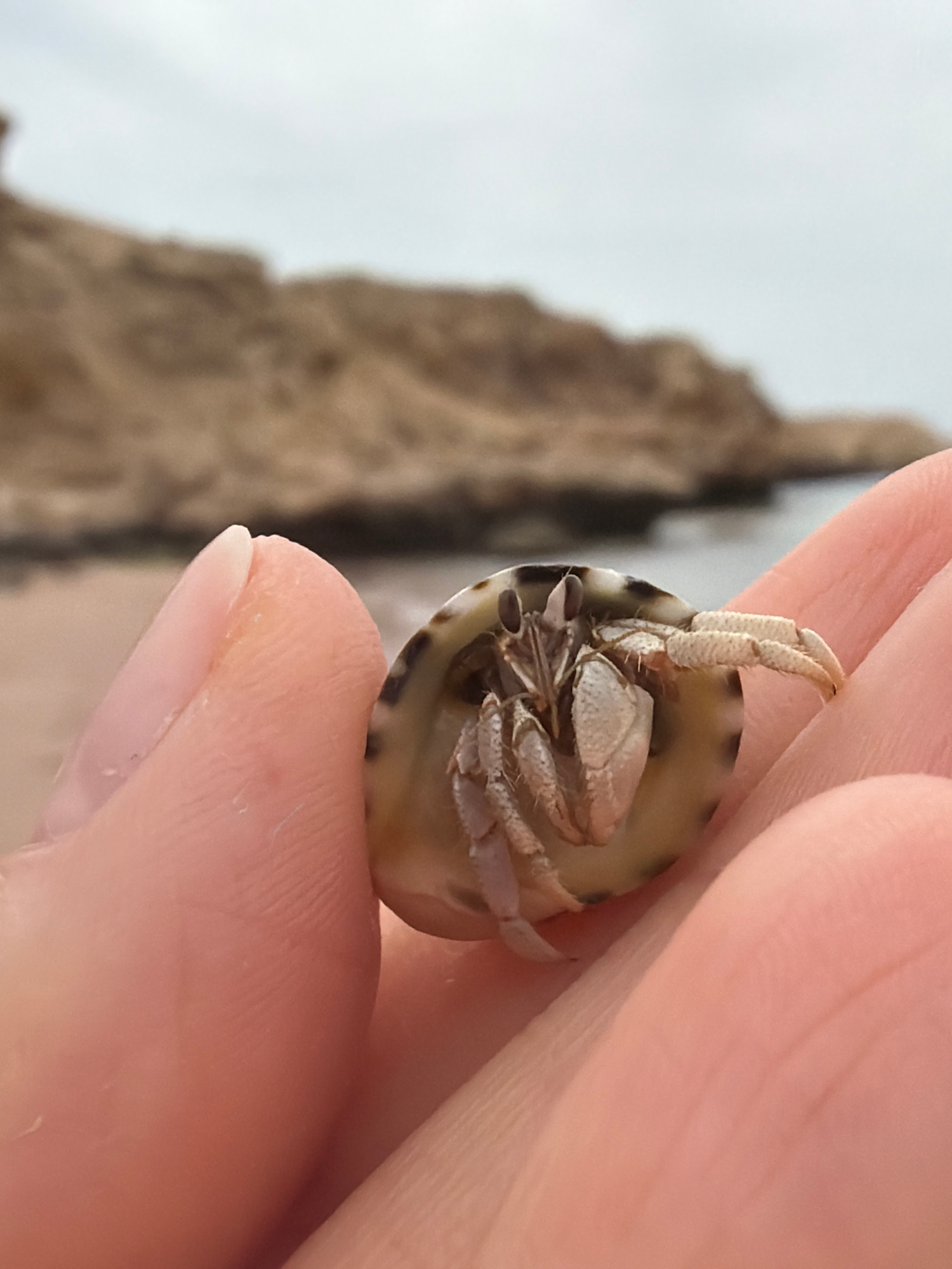 A hermit crab occupies a moon snail shell. It is being held between two fingers. In the background is a beach and the Red Sea in Sharm El Sheikh, Egypt.