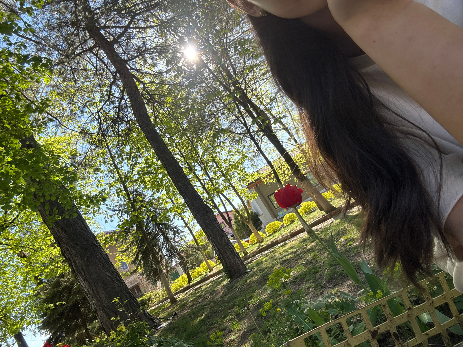 A bright outdoor scene shows a park in Dupnitsa, Bulgaria. Trees are scattered across the grassy area, with buildings and other landscaping visible in the background. A single red tulip stands promine…read more