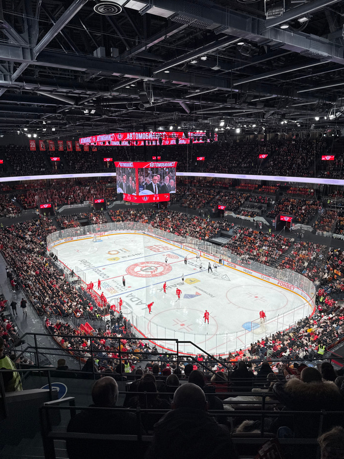 This image depicts an indoor ice hockey arena, specifically the UMMC Arena in Yekaterinburg, Russia, during an event. The scene is observed from an elevated spectator perspective, overlooking a full-s…read more