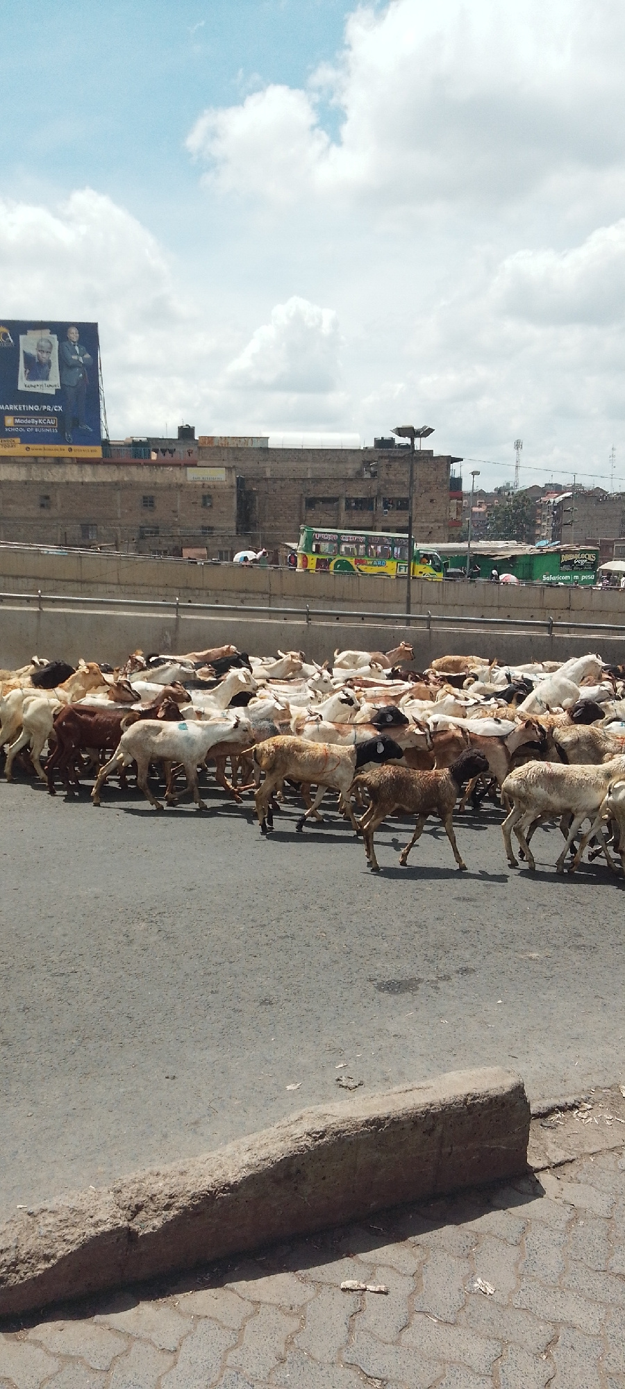 A large herd of goats crosses a paved road in Nairobi, Kenya. The goats are various colors including white, brown, and black. Behind the goats, there is a concrete barrier and several buildings. A col…read more