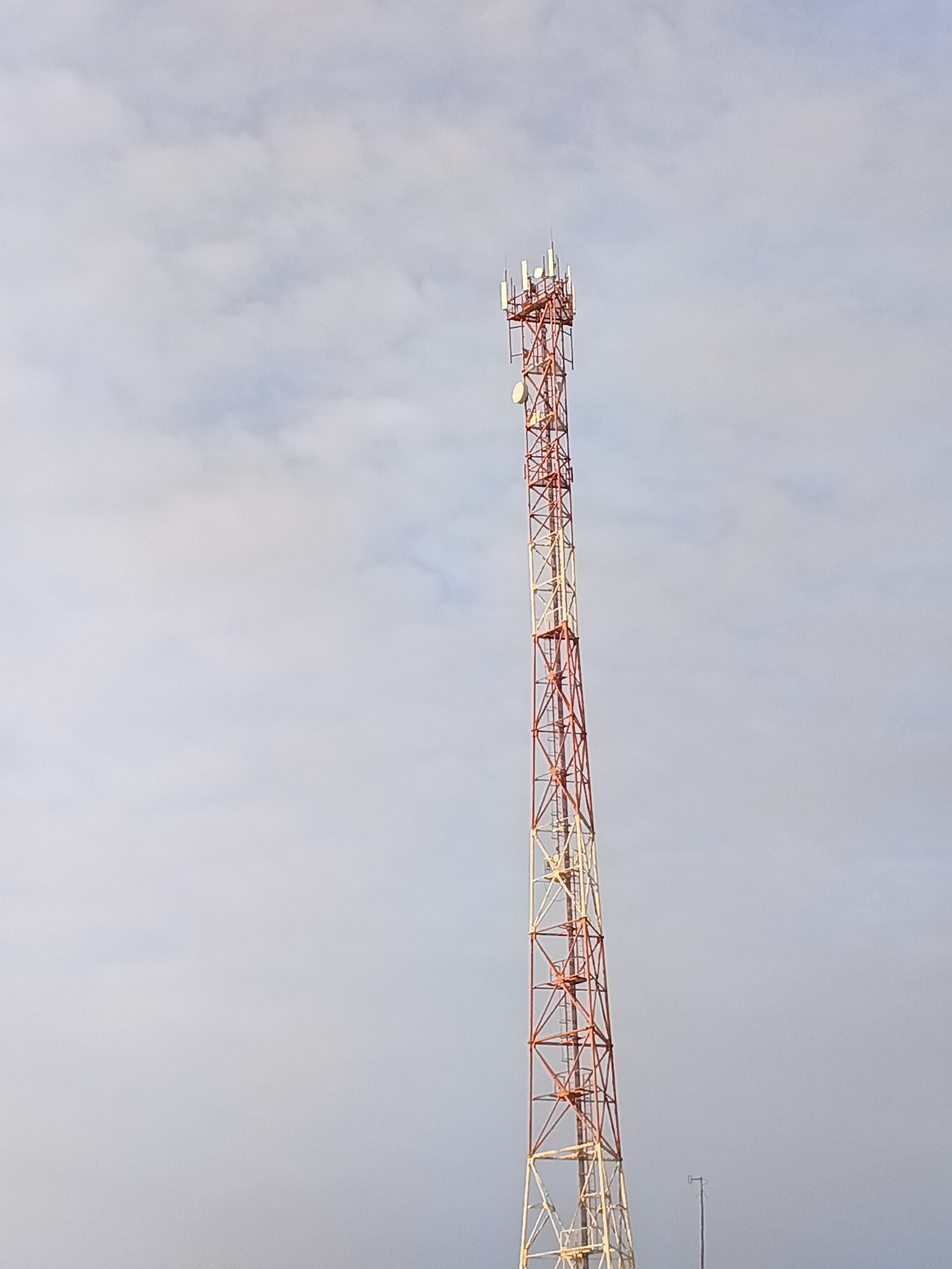 A tall, lattice telecommunications tower stands prominently against a cloudy sky. The tower is constructed with a framework of metal beams, painted in alternating sections of red-orange and off-white…read more