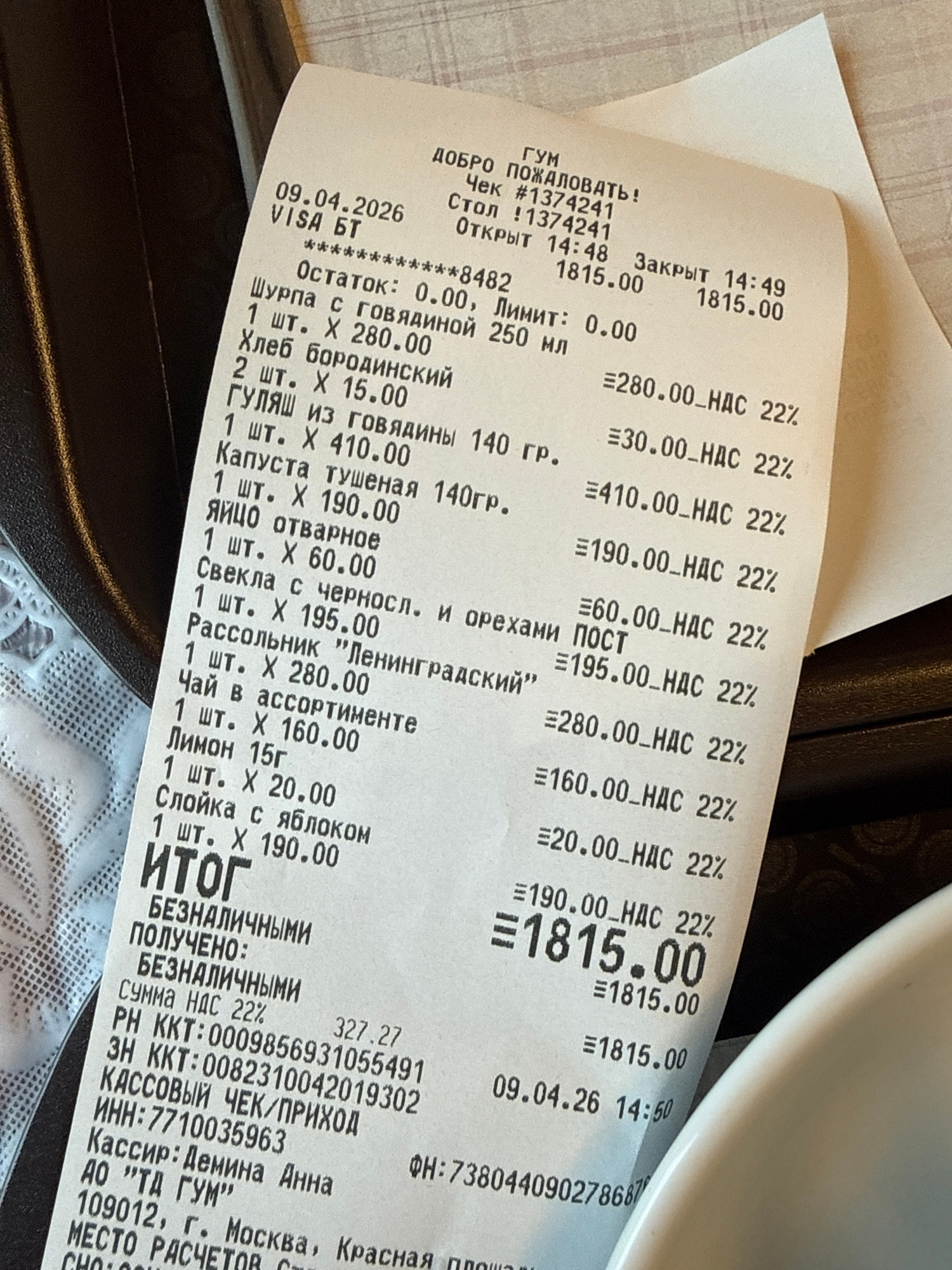 The image shows a close-up of a receipt from "ГУМ", a retail store in Moscow, Russia. The receipt is dated April 9, 2026, and indicates a purchase made with a VISA card. The receipt details a list of…read more