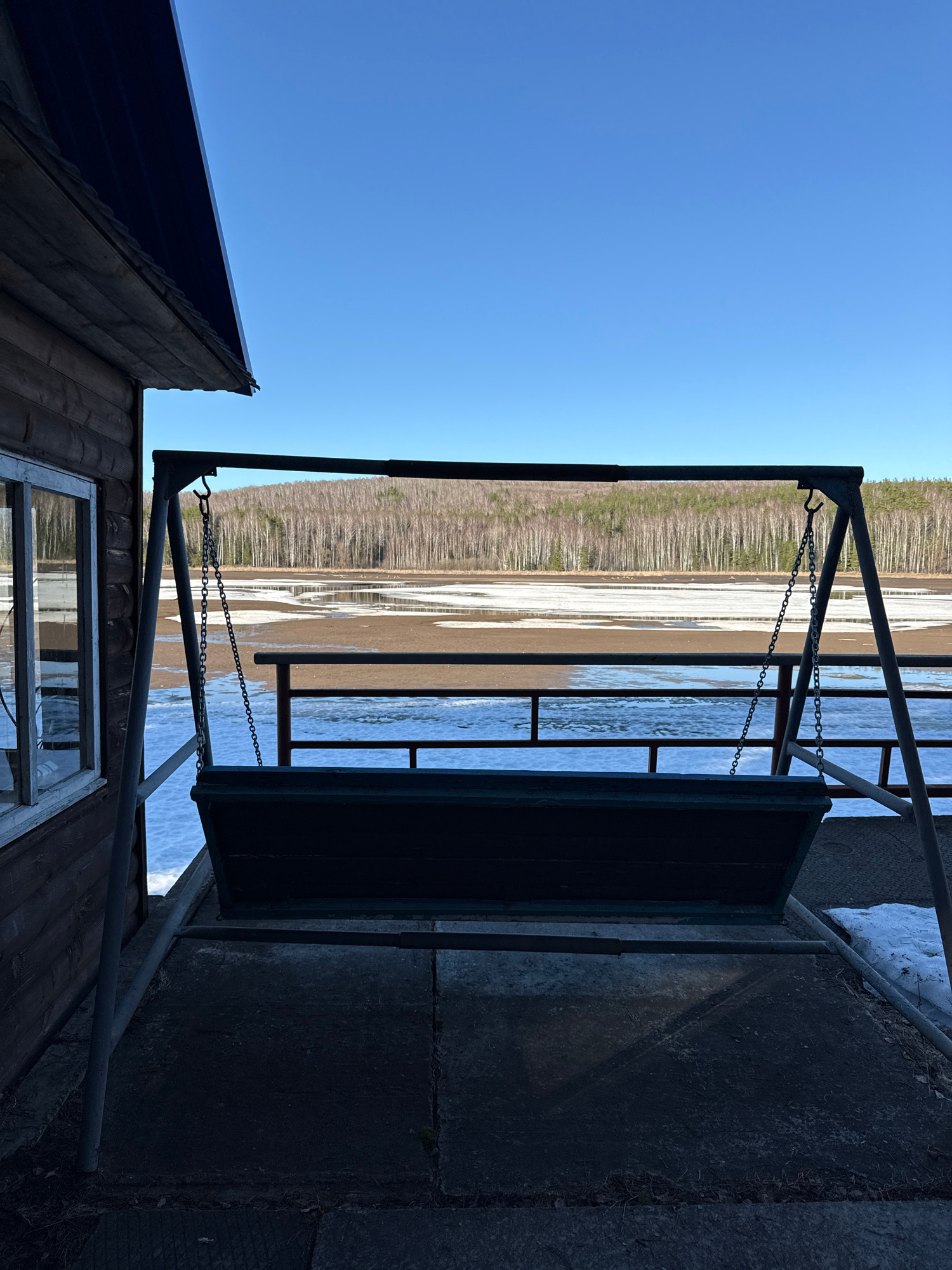 The image shows a hanging swing bench on a metal frame, likely attached to a building on the right, with a concrete platform. The view through the swing frame reveals a river or body of water with mel…read more
