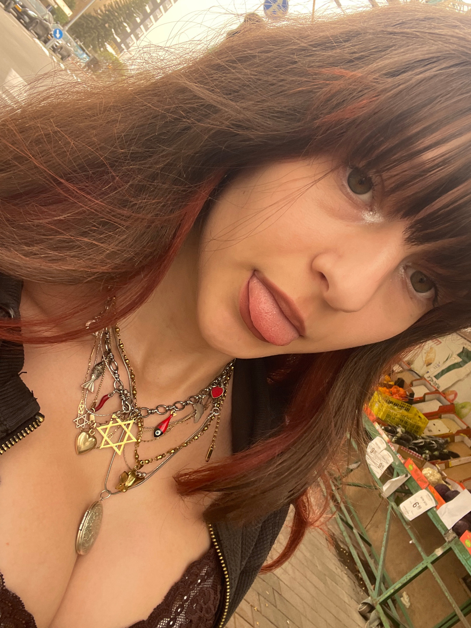 A selfie taken by a young, fair-skinned woman with brown hair and reddish highlights, wearing a black jacket and a necklace with multiple pendants including a Star of David. Her tongue is sticking out…read more