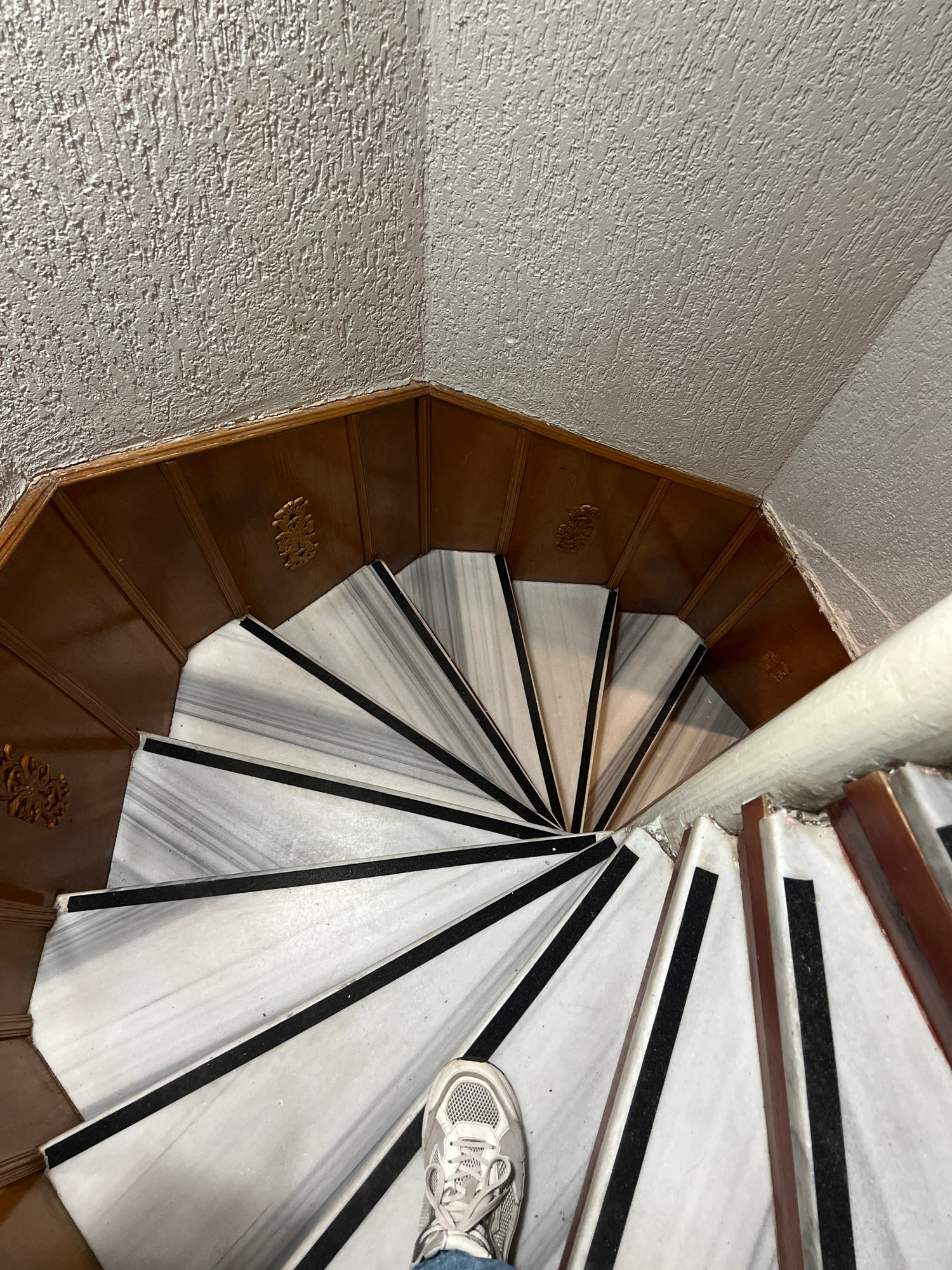 The image shows a spiral staircase, viewed from above. The steps alternate between dark wood on the outer edge and white marble with black stripes towards the center. A white handrail is visible on th…read more