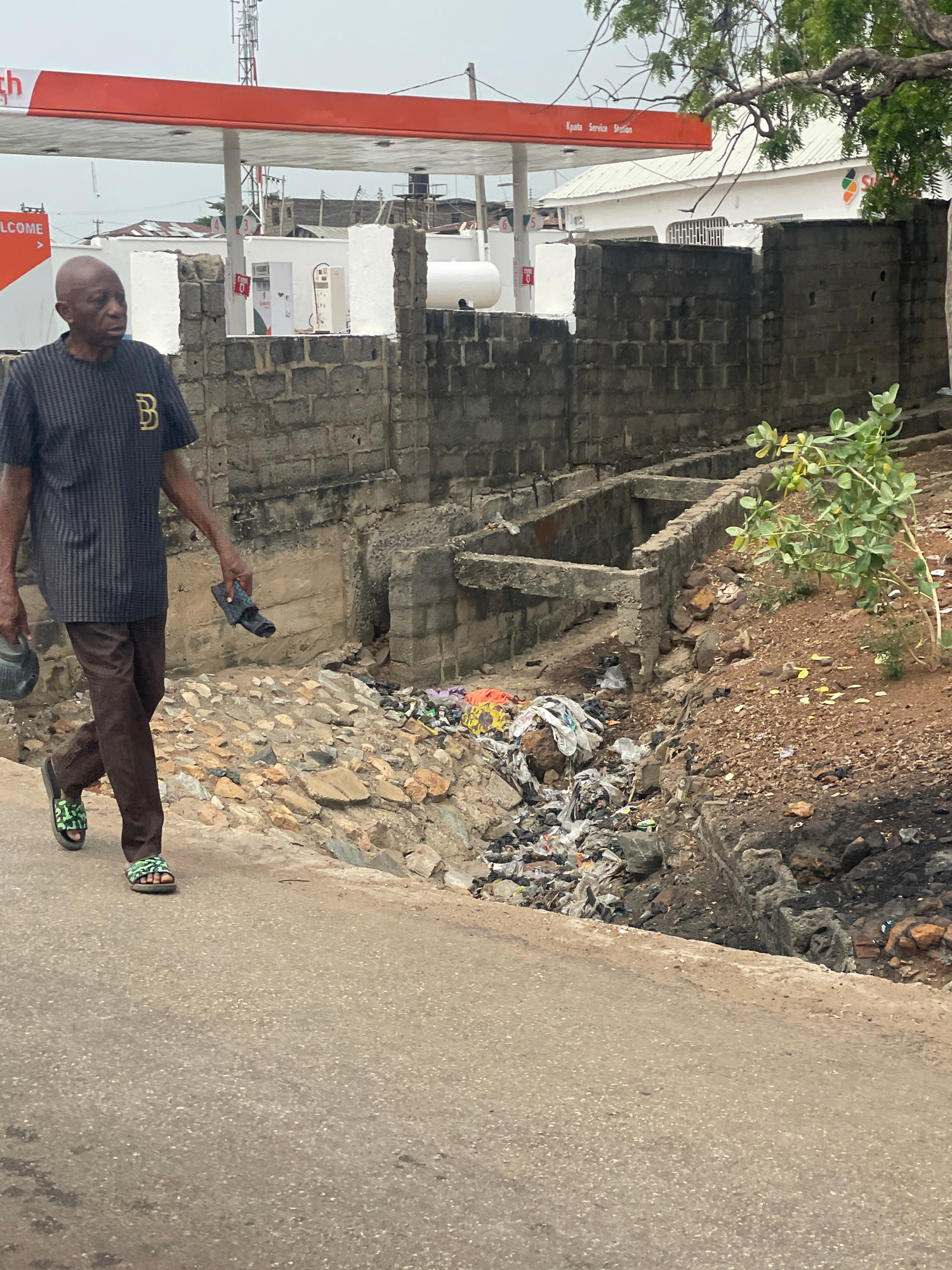 A man stands on a concrete path in Lokoja, Nigeria. He wears brown trousers, black and grey patterned shirt, and patterned sandals. He is holding a small object in his right hand and a hat in his leftβ¦read more
