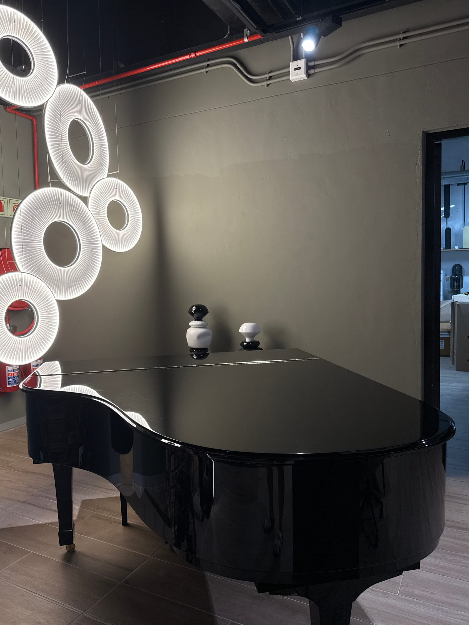 The image depicts the interior of a space in Cape Town, South Africa, featuring a polished black grand piano. Circular LED light fixtures hang from the ceiling. Electrical conduits and fire suppressio…read more
