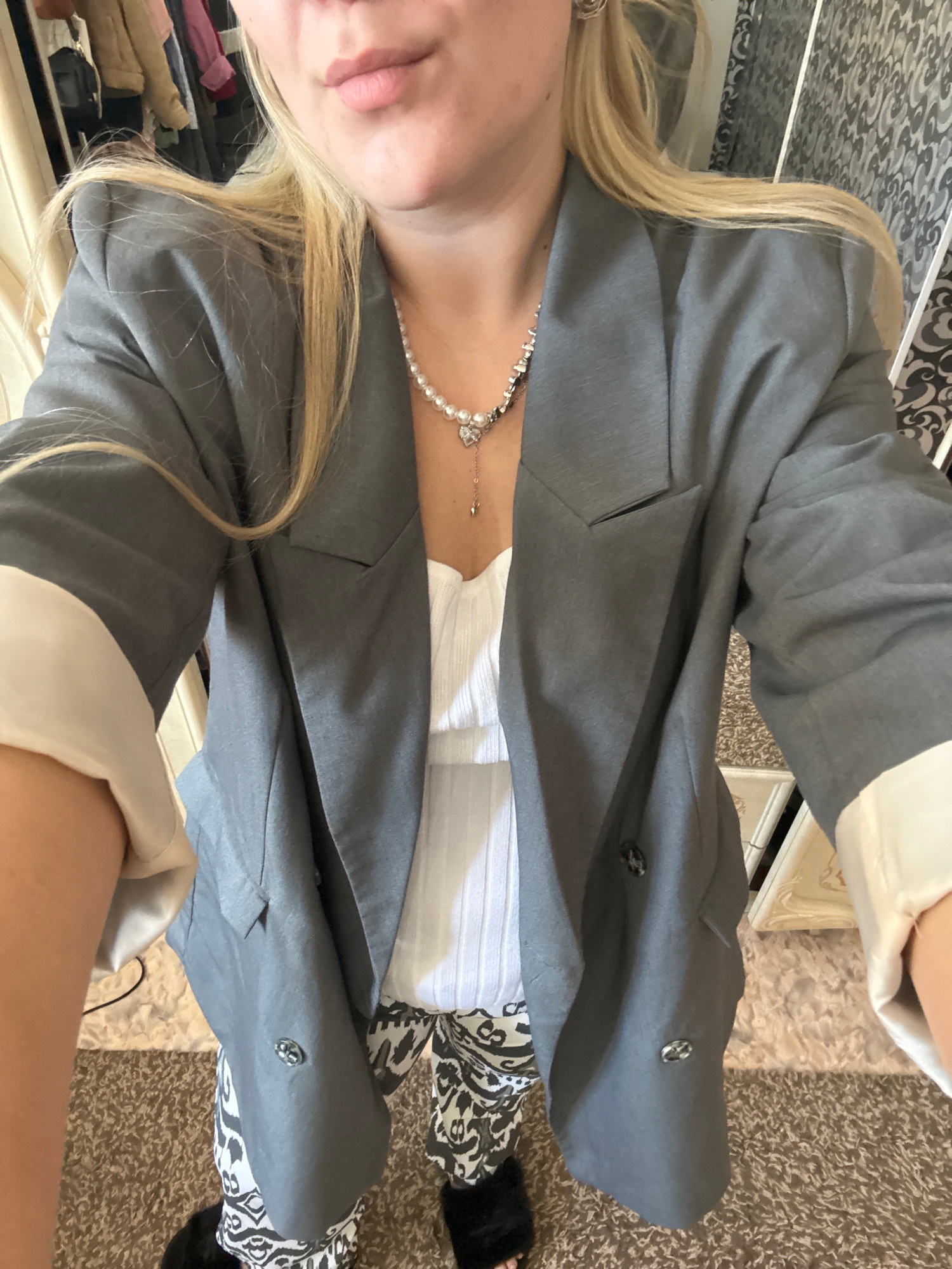 A fair-skinned person with long blonde hair is wearing a gray blazer over a white top and patterned pants. A pearl necklace adorns their neck. The background includes a patterned surface, possibly a b…read more
