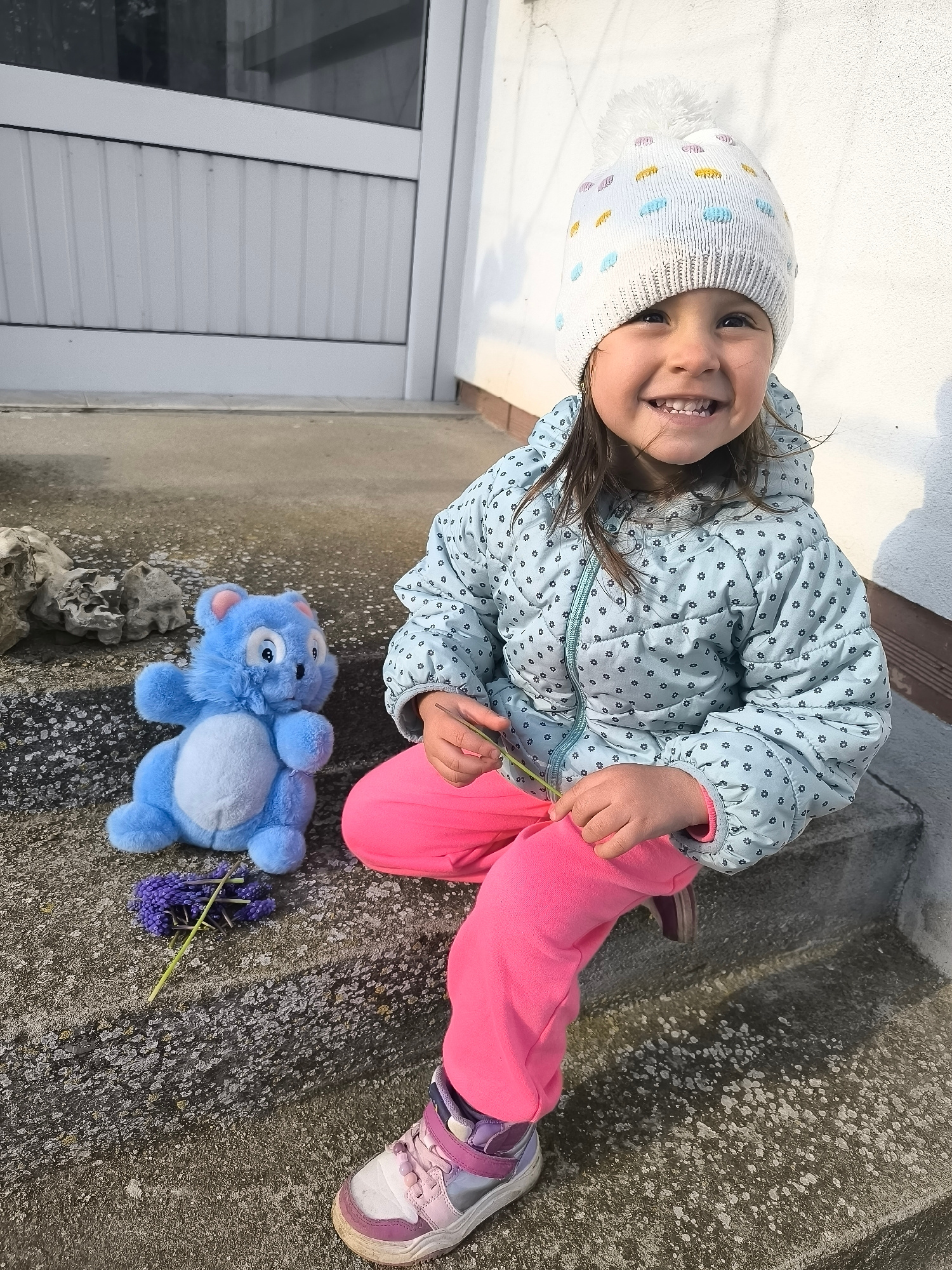 A young girl in a light blue polka-dot puffer jacket, pink pants, and a white beanie sits on a concrete step next to a blue stuffed animal and a small bunch of purple flowers. The background shows a w…read more