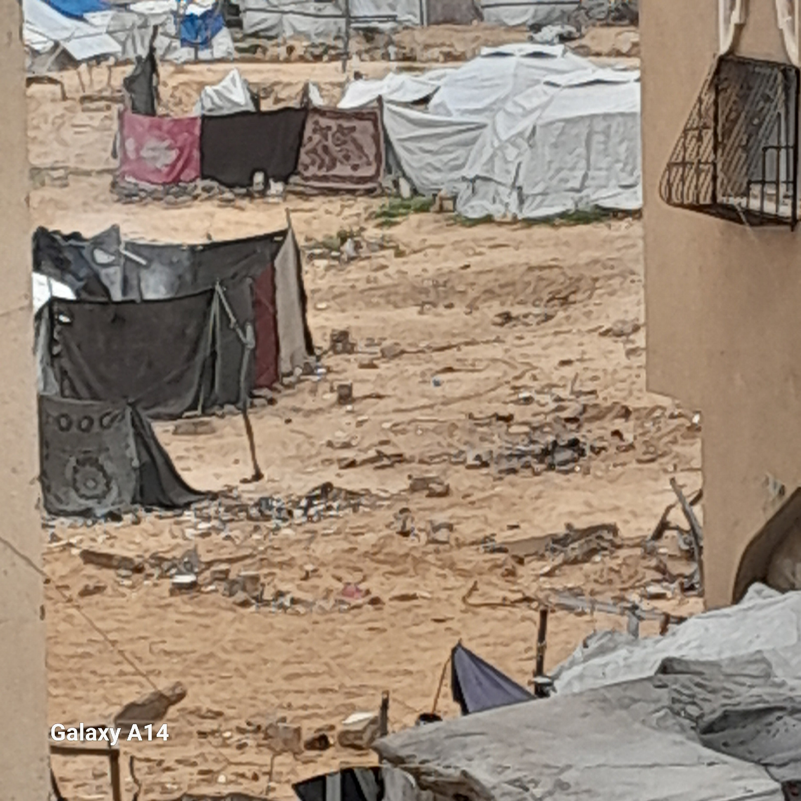 The image shows a street in Khan Yunis, Palestinian Territory, with dwellings covered in fabric and debris. A metal cage is in the upper left. Various pieces of fabric hang from the structures. The te…read more