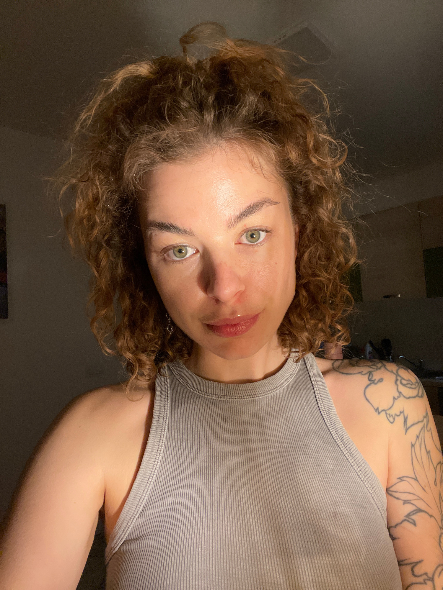 A woman with curly red hair and light green eyes, wearing a gray ribbed tank top, is angled towards the camera. She has a tattoo on her upper left arm and shoulder. The background is dimly lit, reveal…read more