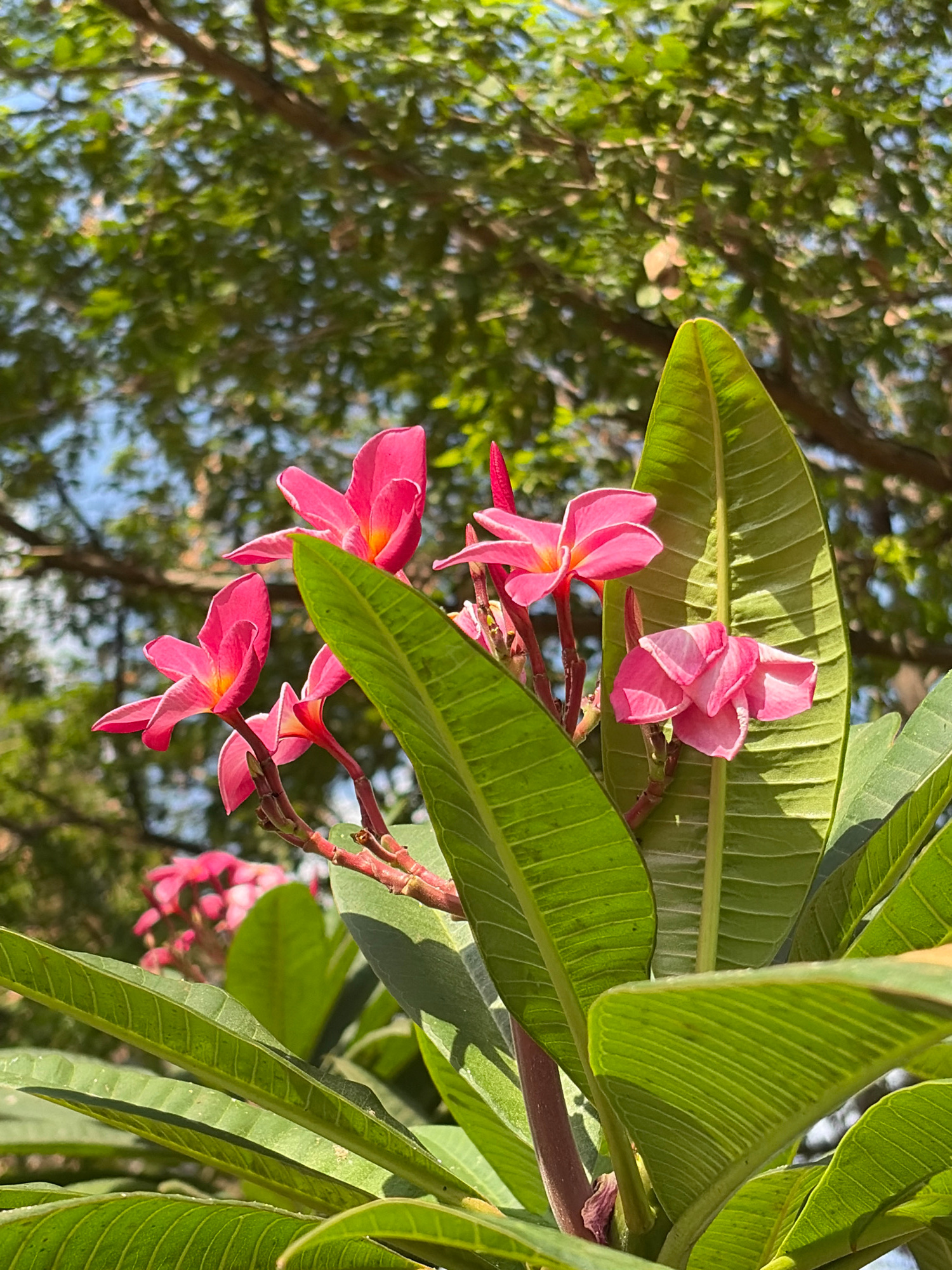 The image captures a cluster of pink plumeria flowers and their associated green leaves against a backdrop of tree branches and sky, likely taken in Ciudad Guayana, Venezuela. The flowers are in vario…read more