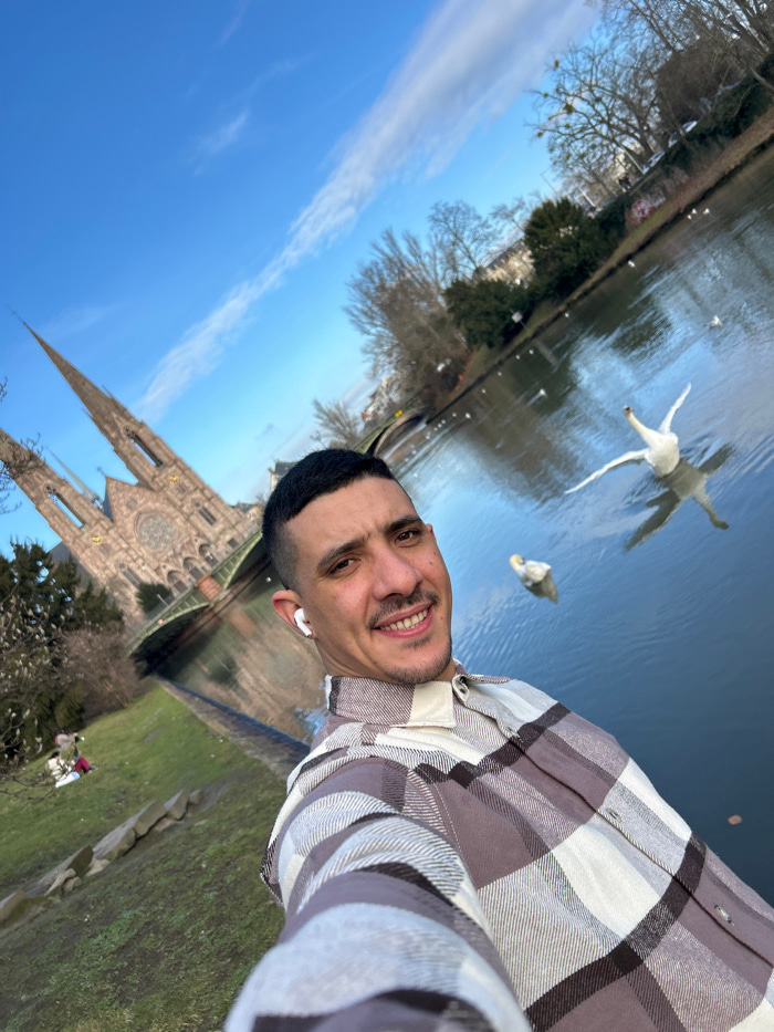 A male individual is depicted in a selfie, smiling directly at the camera. He wears a plaid shirt patterned in white, light brown, and dark brown, and white wireless earbuds are visible in both ears.…read more