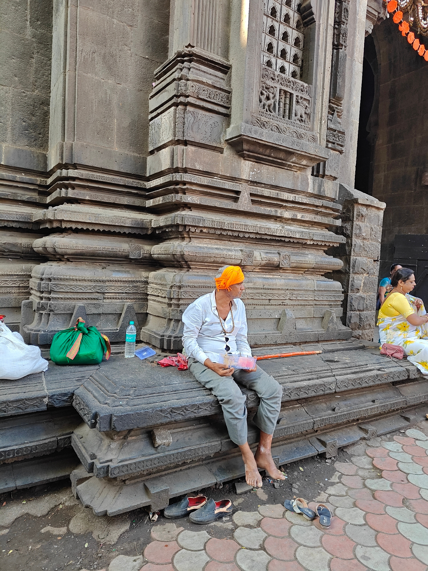 A medium shot shows an Indian man with bare feet sitting on steps in front of a stone building. The man is wearing an orange turban, gray pants, and a white long-sleeved shirt. He is holding a clear p…read more