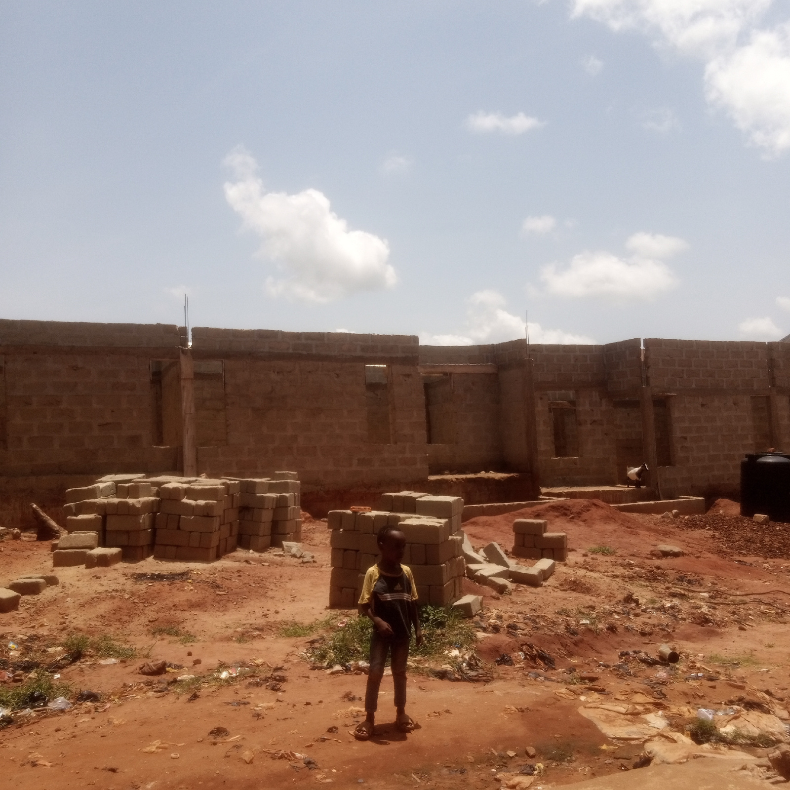 The image depicts a construction site in Ukwu-Abwa, Nigeria. An unfinished brick building stands in the background. Piles of bricks are scattered in the foreground. A young boy wearing a yellow-and-bl…read more