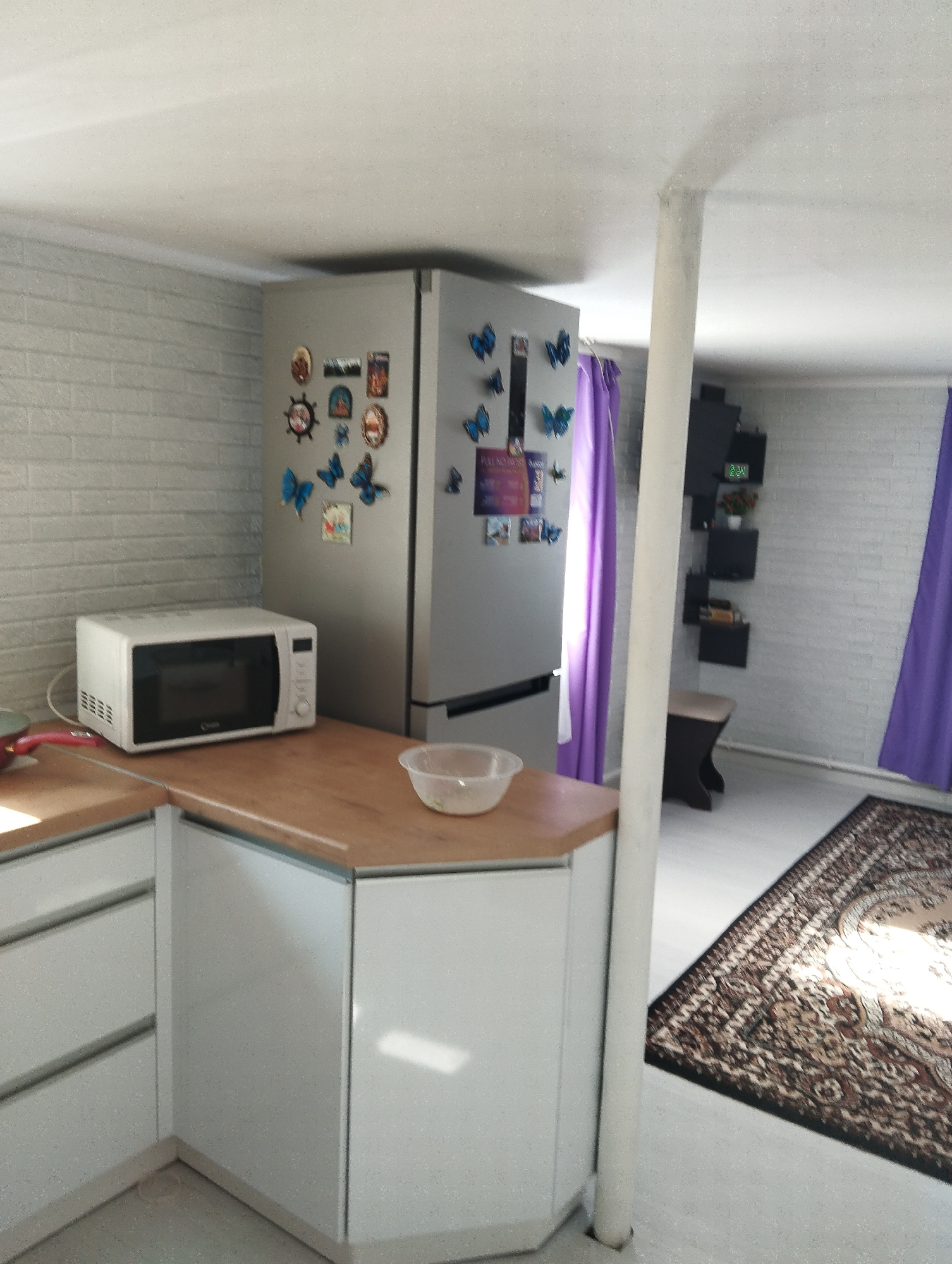 The image depicts an interior space in Krasnogorskoye, Russia. A kitchen area with light grey brick walls is visible on the left, featuring white cabinets with light wood countertops, a white microwav…read more