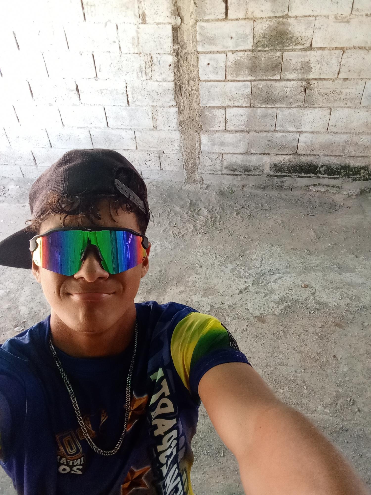 A young man stands indoors against a cinder block wall. He wears a dark-colored baseball cap with the bill angled to his left, rainbow-tinted sunglasses, a dark blue t-shirt with yellow and green acce…read more