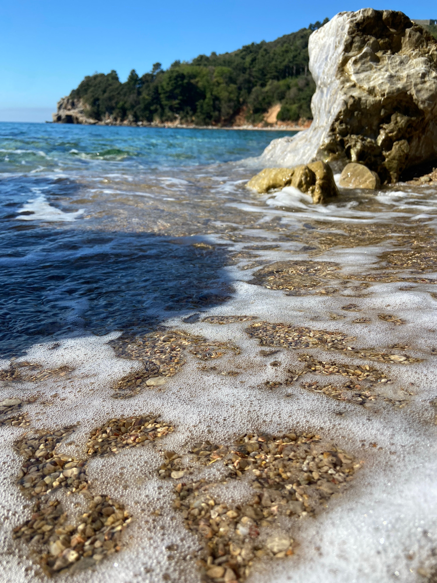 The image depicts a close-up view of the shoreline at a beach, possibly in or near Budva, Montenegro. The beach is characterized by small pebbles and stones being washed by the foamy surf. The water t…read more