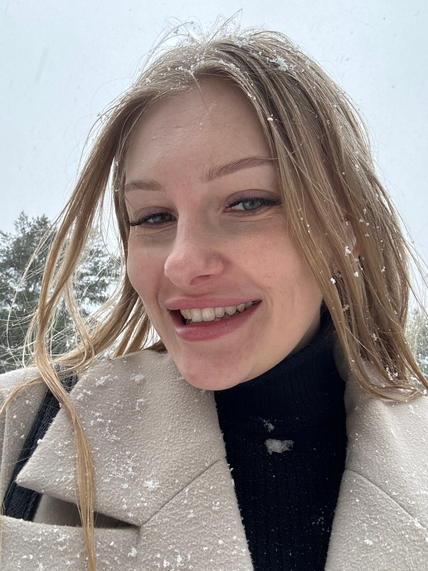 A close-up, angled portrait captures a smiling woman with blonde hair dusted with snow. She wears a black turtleneck under a light-colored coat, also speckled with snowflakes. The background shows a b…read more