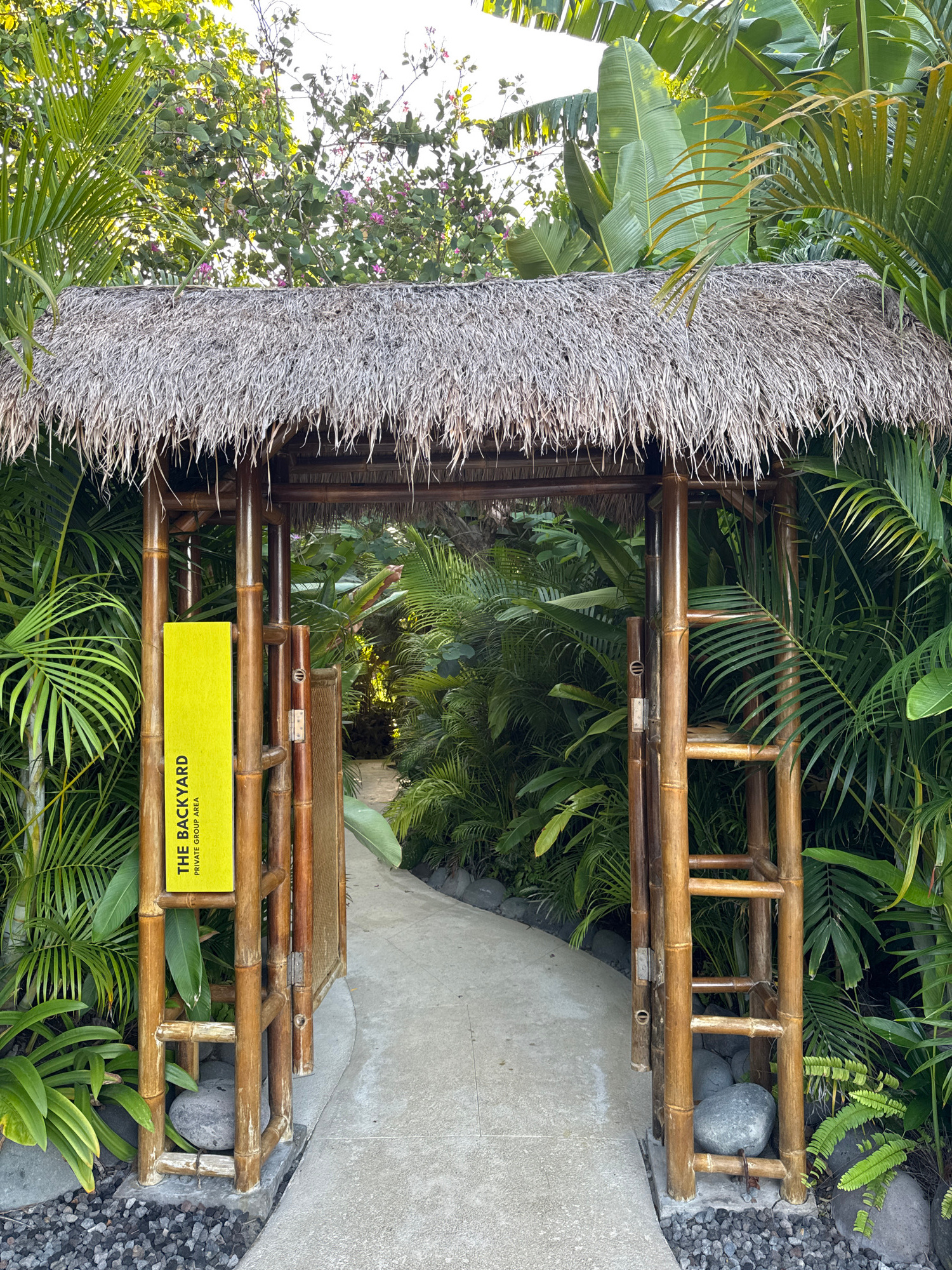 The scene depicts a bamboo entrance structure under a thatched roof, leading to "The Backyard," a private group area. The entrance is framed by lush tropical foliage, including palm trees and banana p…read more