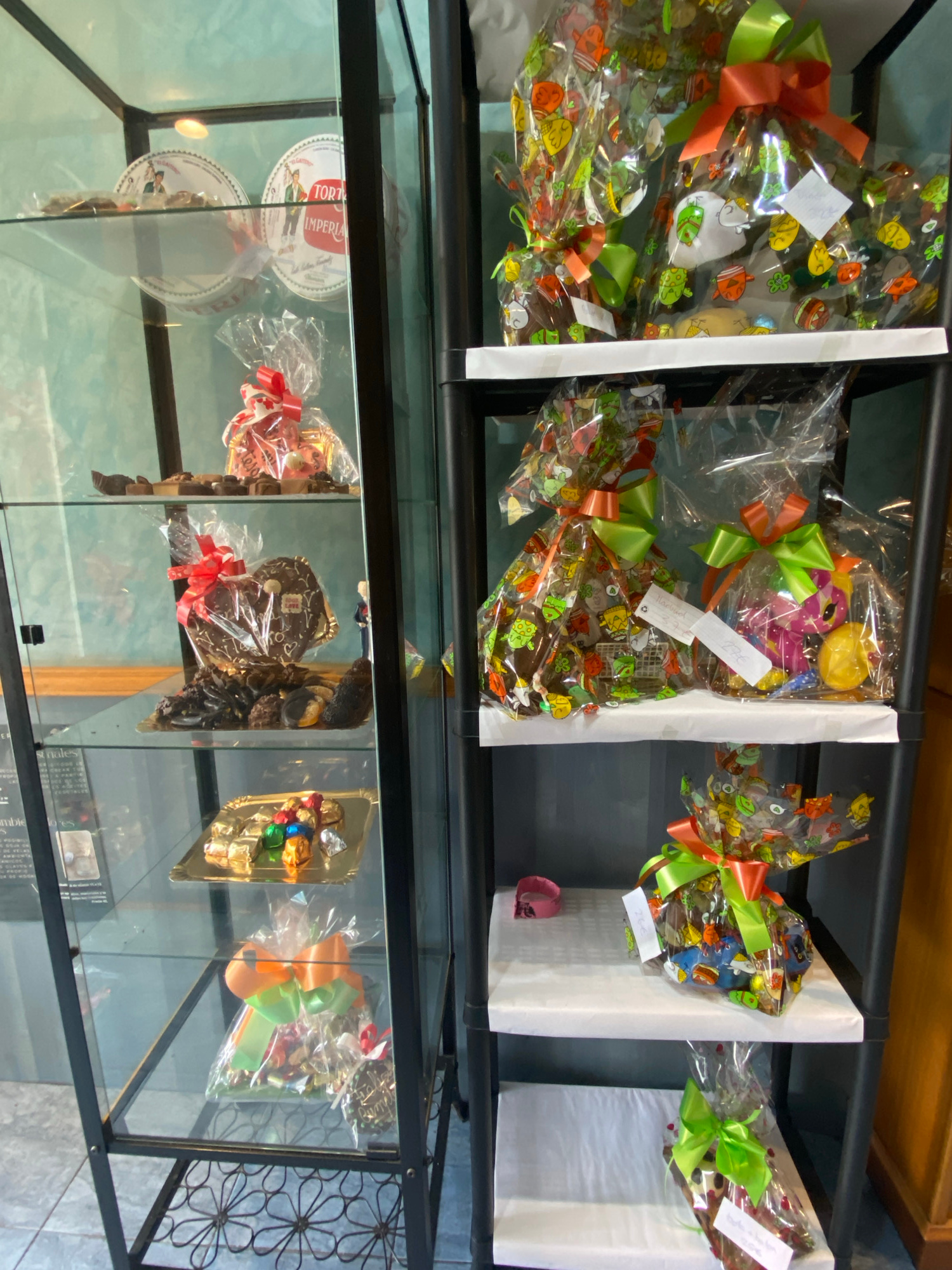 The image depicts a display case in what appears to be a confectionery shop, likely located in Villaviciosa, Spain, given the products and general presentation. The top shelf contains multiple cellop…read more