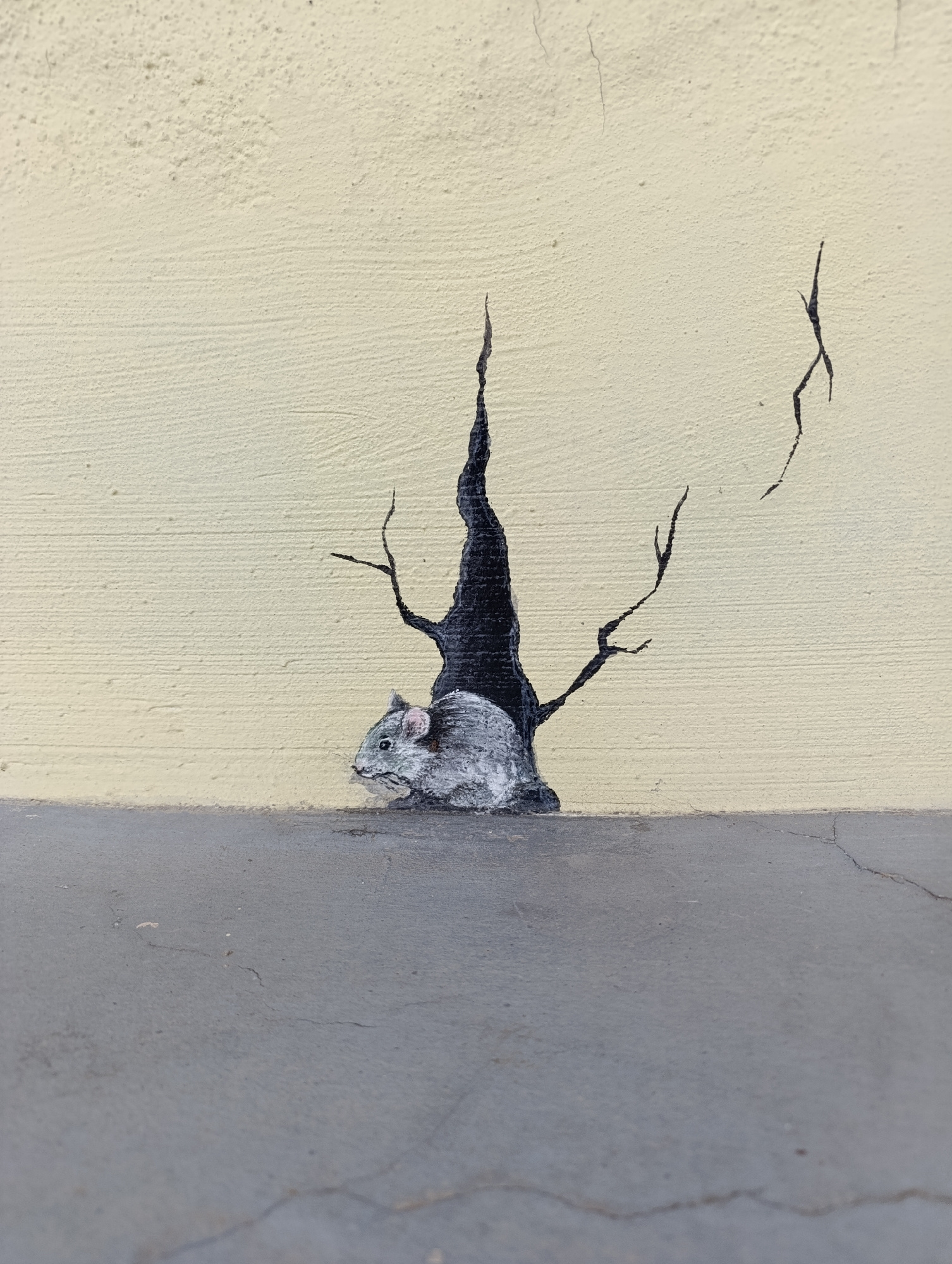The image is of a Banksy-style mural in Haskovo, Bulgaria. It is located on a wall that is divided into two sections, a light beige top half and a grey bottom half with cracks. The mural depicts a gre…read more