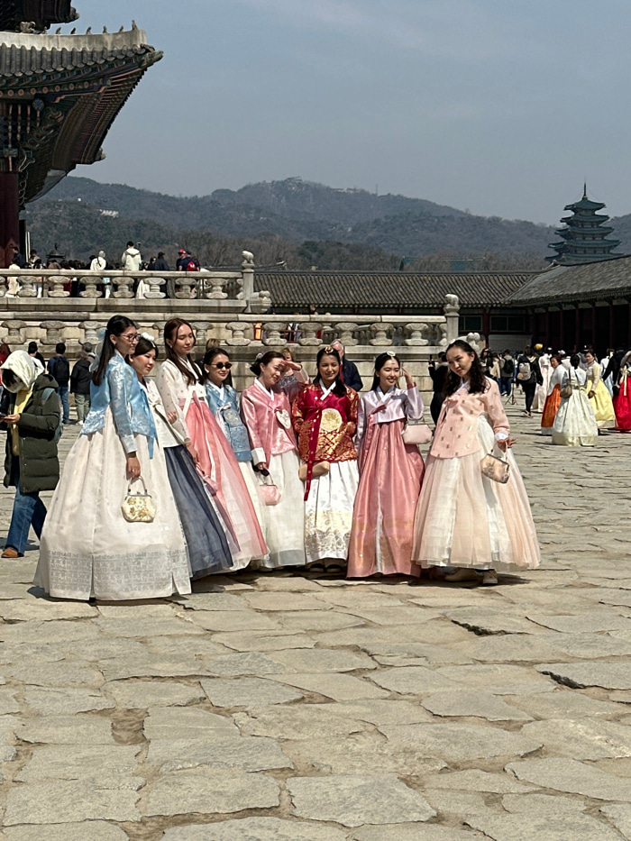 A group of eight individuals, primarily female, are positioned in the foreground of a large, irregular stone-paved courtyard at Gyeongbokgung Palace in Seoul, South Korea. All eight individuals wear t…read more