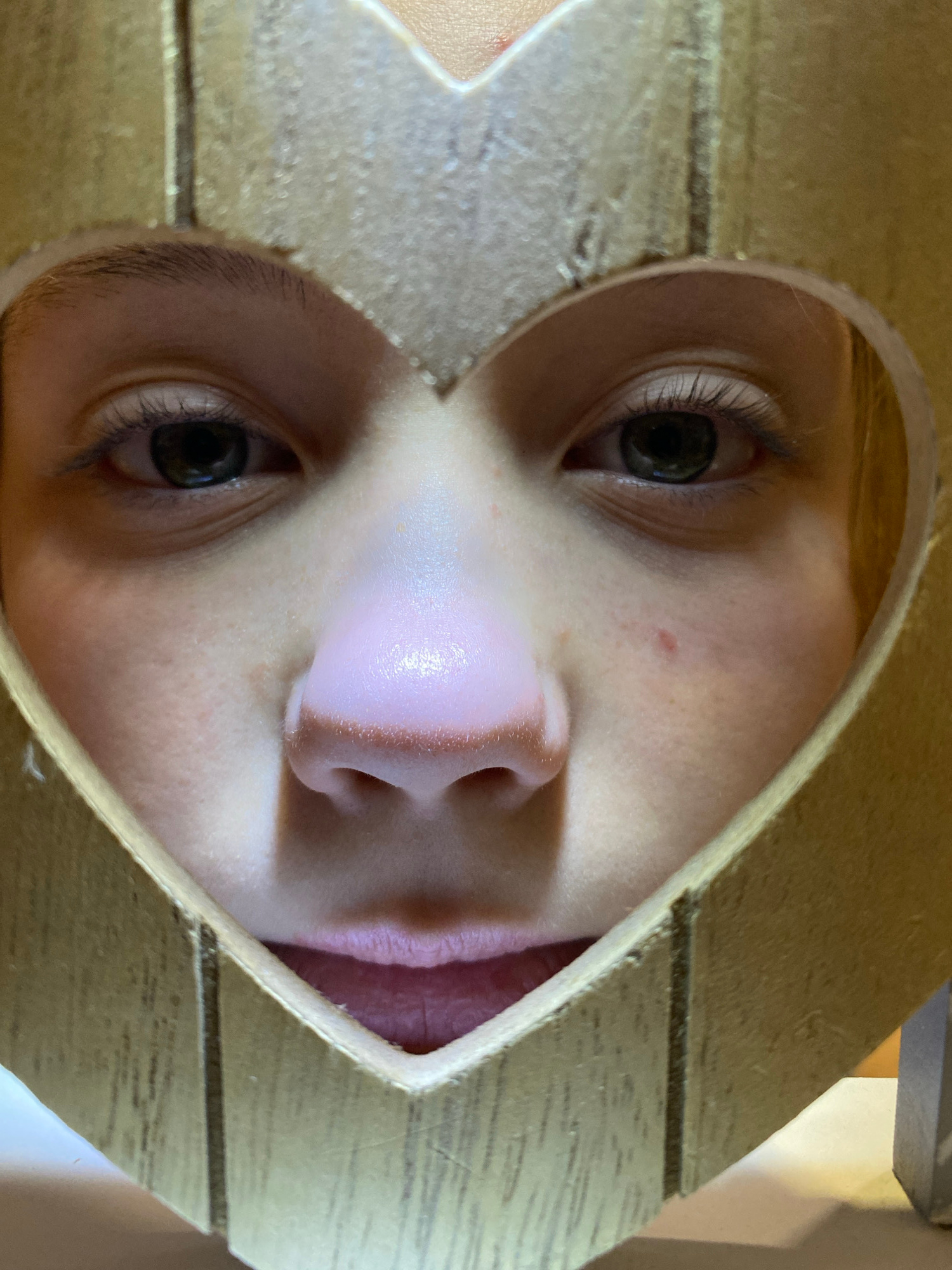 A close-up, vertically inverted shot focuses on a person's face framed by a heart-shaped object, likely made of wood. The person's eyes, nose, and part of their mouth are visible. The wood frame has aβ¦read more