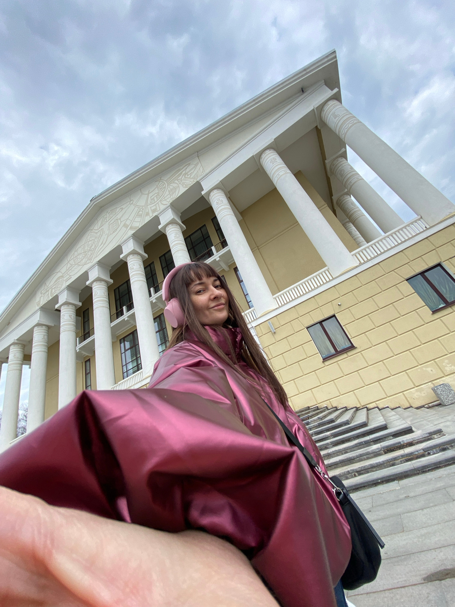 A low-angle shot depicts a woman wearing headphones and a shiny burgundy jacket, positioned in front of a building in Votkinsk, Russia. The building features white pillars and a decorative facade. Win…read more