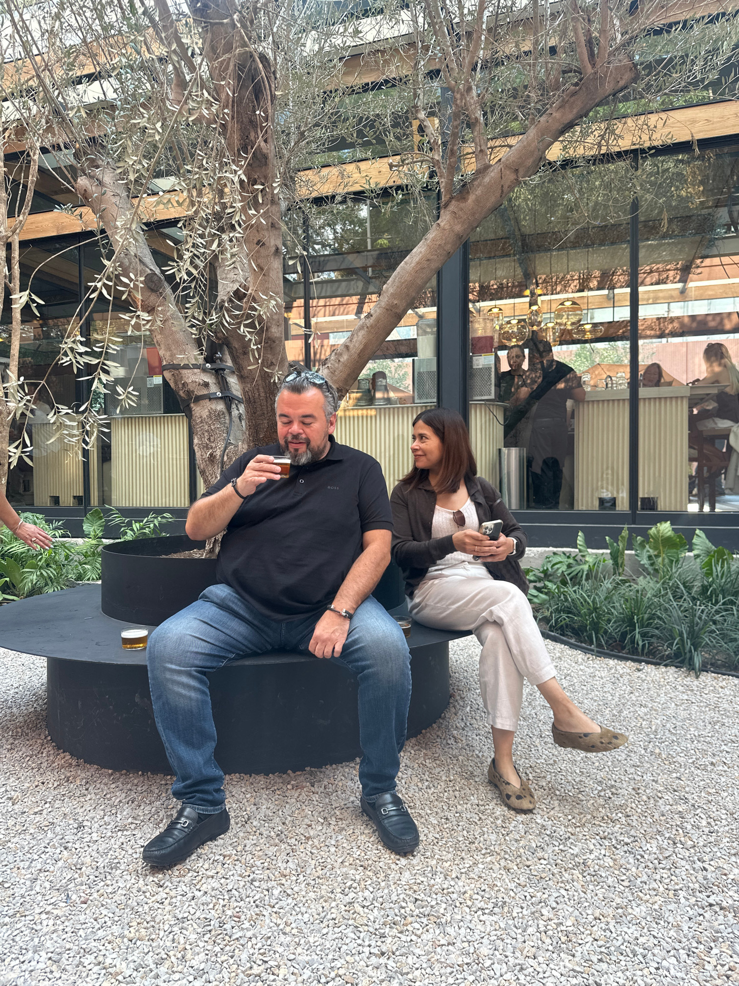 Here is a description of the image: Two people are seated on a black circular bench in what appears to be an outdoor patio or garden area. The man, with dark hair and a beard, wears a black shirt and…read more